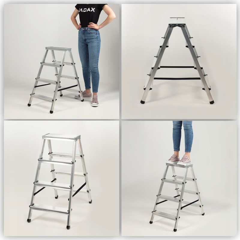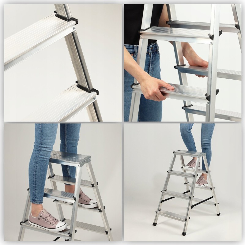Möchten Sie eine höhere oder niedrigere Leiter wählen? Sie können frei entscheiden, denn wir bieten die doppelseitige Leiter in fünf Ausführungen an: 4, 5, 6, 7 und 8 Stufen.