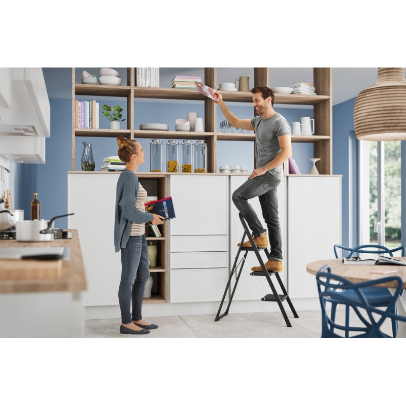 Zusammengeklappt ist die Leiter nur 5 cm dick, was die Aufbewahrung im Schrank oder im Kofferraum erleichtert. So ist sie immer griffbereit, wenn Sie sie brauchen.