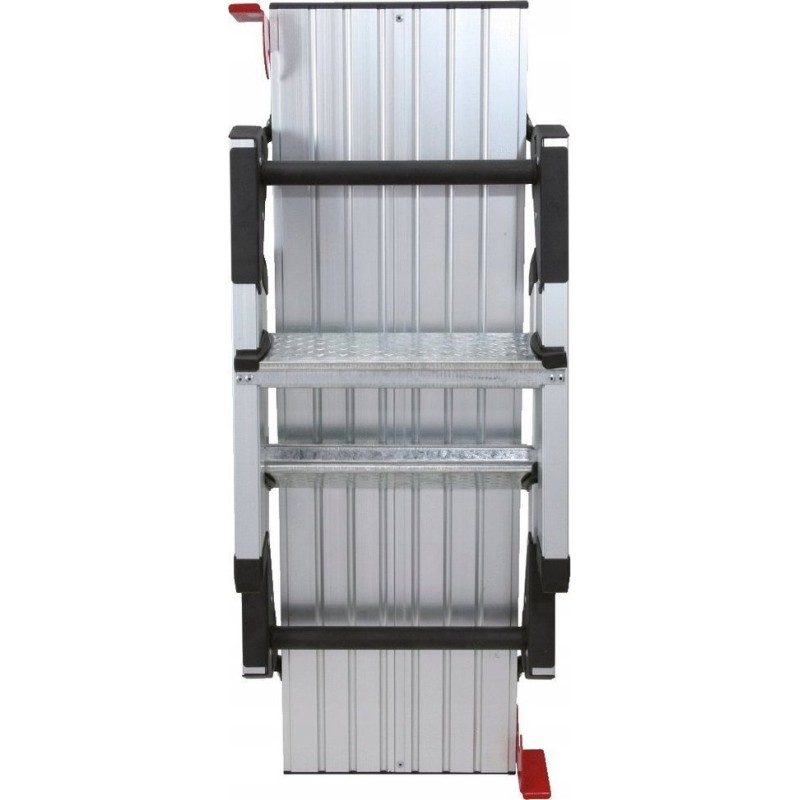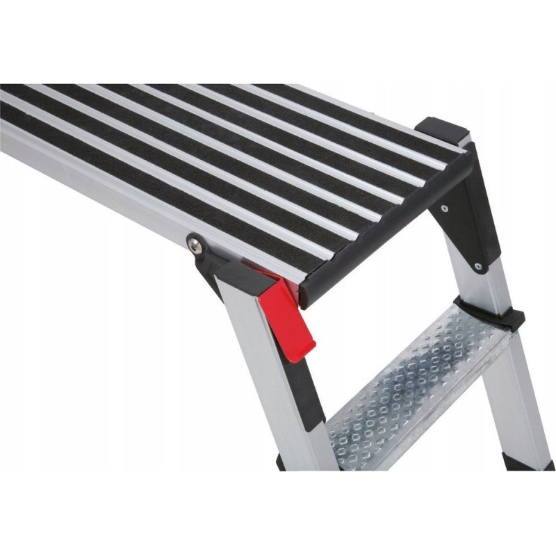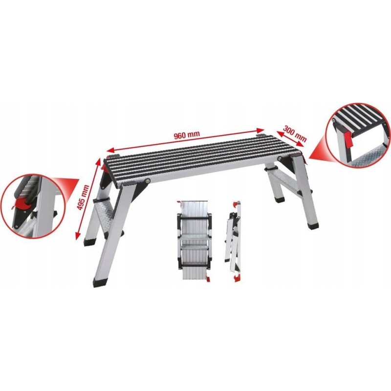 Die Plattform verfügt über eine große Standfläche und Sicherheitsverriegelungen, was ein sicheres und komfortables Arbeiten mit Werkzeugen ermöglicht. Die Plattform ist zusammenklappbar und nimmt daher bei der Lagerung wenig Platz ein. Kunststoffkappen an den Beinen schützen den Boden vor Kratzern.
