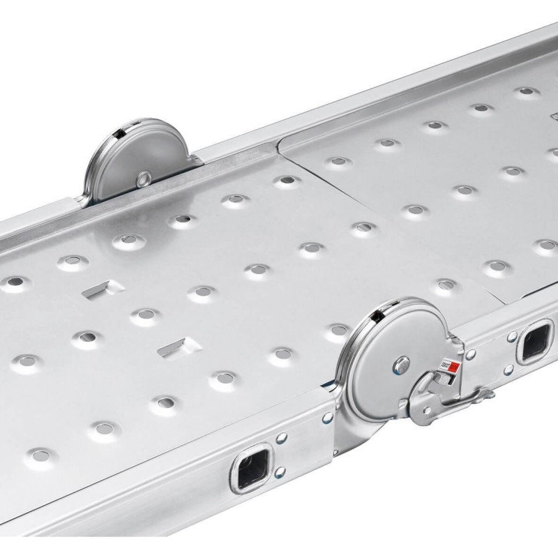 Die Hailo M60 ist mit einer Arbeitsplattform aus Metall mit den Maßen 143 x 30 cm ausgestattet, was zusätzlichen Platz und Komfort bei Arbeiten in der Höhe bietet. Die Höhe der Arbeitsplattform beträgt 91 cm, was den Zugang zu schwer erreichbaren Stellen erleichtert.