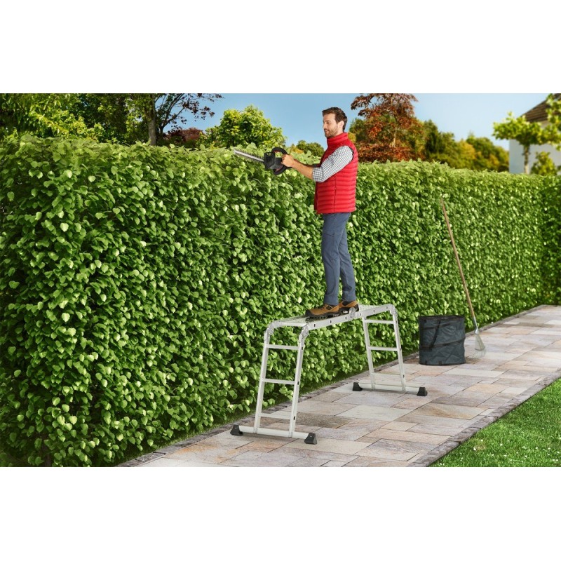 Die Hailo M60 bietet die Möglichkeit, in verschiedenen Konfigurationen eingesetzt zu werden, was sie äußerst funktional macht. Sie kann als Anlehne- oder freistehende Leiter aufgestellt werden, wodurch sie an die individuellen Bedürfnisse des Benutzers angepasst werden kann. Dadurch eignet sich die Leiter für viele Situationen, vom Streichen von Wänden bis hin zu Gartenarbeiten.