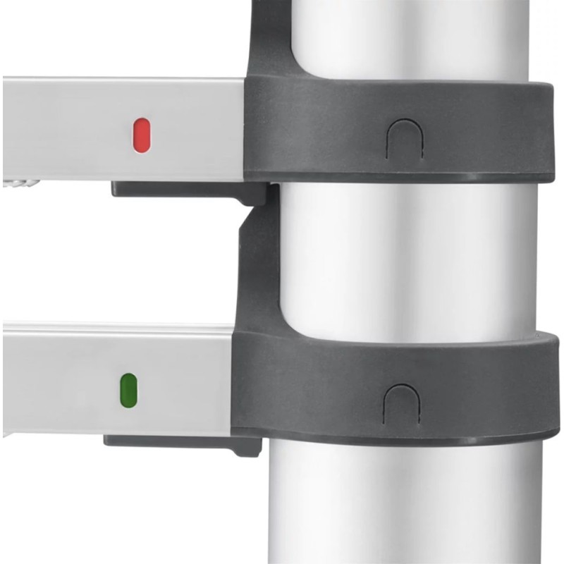 Die Teleskopleiter FlexLine 260 kann als Anlegeleiter verwendet werden. Die Höhe lässt sich durch Verschieben der einzelnen Sprossen einstellen, und der sichere Abstand zwischen den Sprossen verhindert das Risiko von Fingerverletzungen. Das einzigartige Einhand-Entriegelungssystem ermöglicht ein schnelles und sicheres Zusammenklappen der Leiter. Dank der farbigen Markierung lässt sich überprüfen, ob die Sprossen verriegelt sind. Eine Gummischutzleiste verhindert Beschädigungen an Wänden.