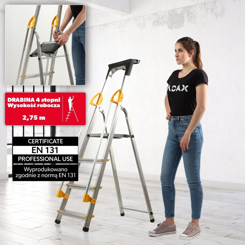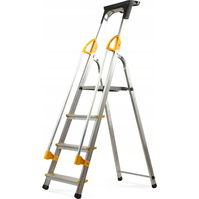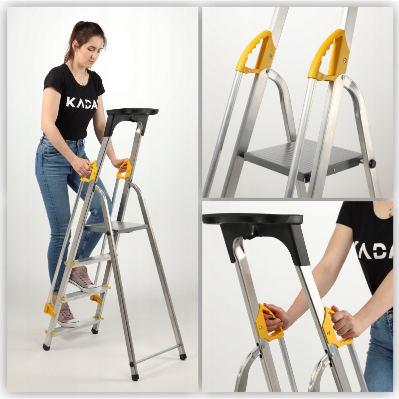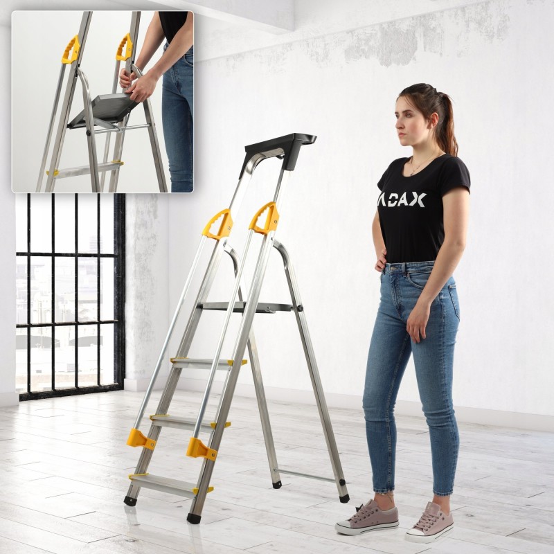Darüber hinaus verfügt die Haushaltsleiter über ergonomische Handläufe, die das Auf- und Absteigen erleichtern. Außerdem gibt es einen 60 cm hohen Bügel mit Ablage, der vor Stürzen schützt.