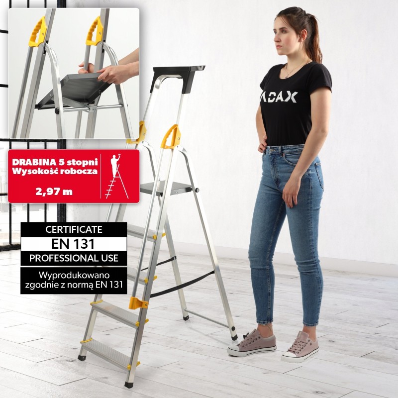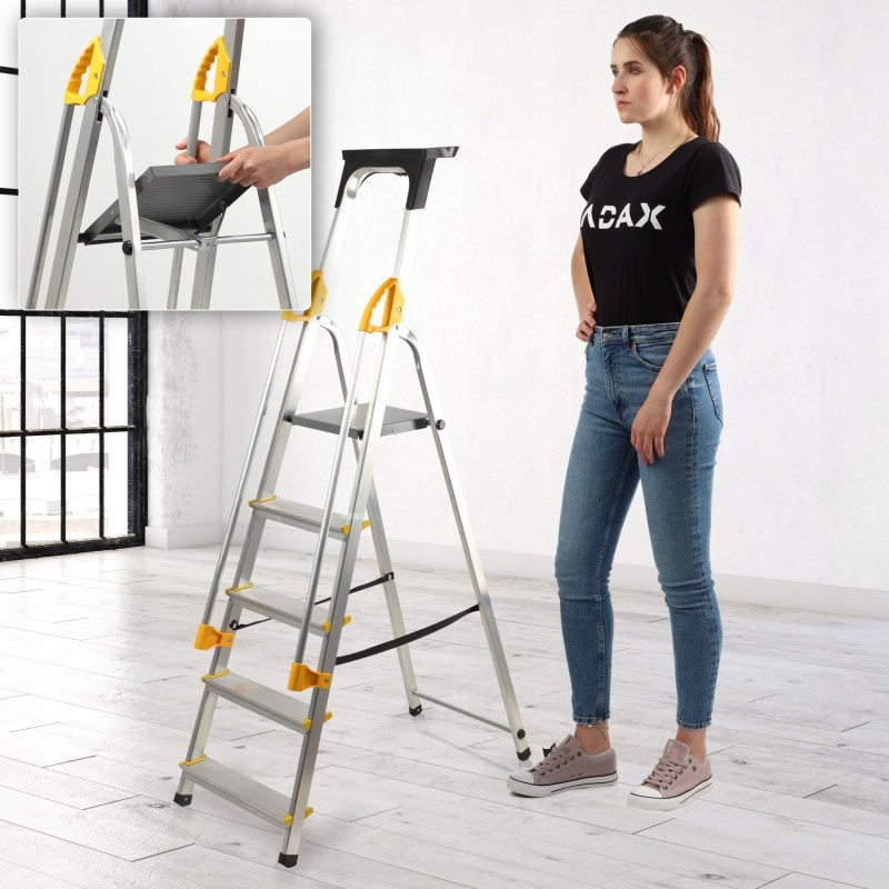 Darüber hinaus verfügt die Haushaltsleiter über ergonomische Handläufe, die das Auf- und Absteigen erleichtern. Außerdem gibt es einen 60 cm hohen Bügel mit Ablage, der vor Stürzen schützt.