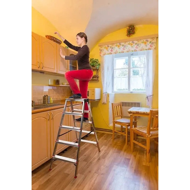Die doppelseitige 5-stufige Aluminium-Klappleiter ist eine praktische und funktionale Lösung, die sich sowohl im Haus als auch im Garten hervorragend bewährt. Dank ihrer Vielseitigkeit eignet sich diese Leiter ideal für vielfältige Arbeiten in der Höhe und gewährleistet gleichzeitig Komfort und Sicherheit bei der Nutzung.