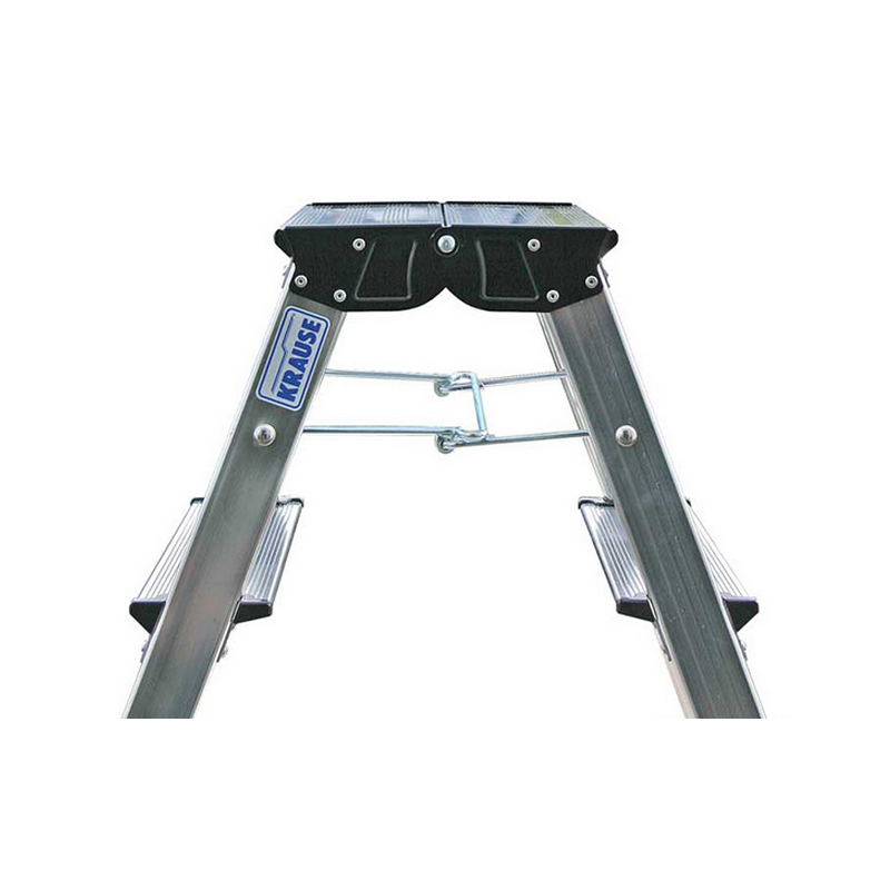 große obere Standplattform 350 x 200 mm, die eine stabile Arbeitsposition gewährleistet stabile, langlebige Metallgelenke an den Längsstreben integrierte Sicherung gegen selbstständiges Zusammenklappen der Stufen geringe Abmessungen im zusammengeklappten Zustand