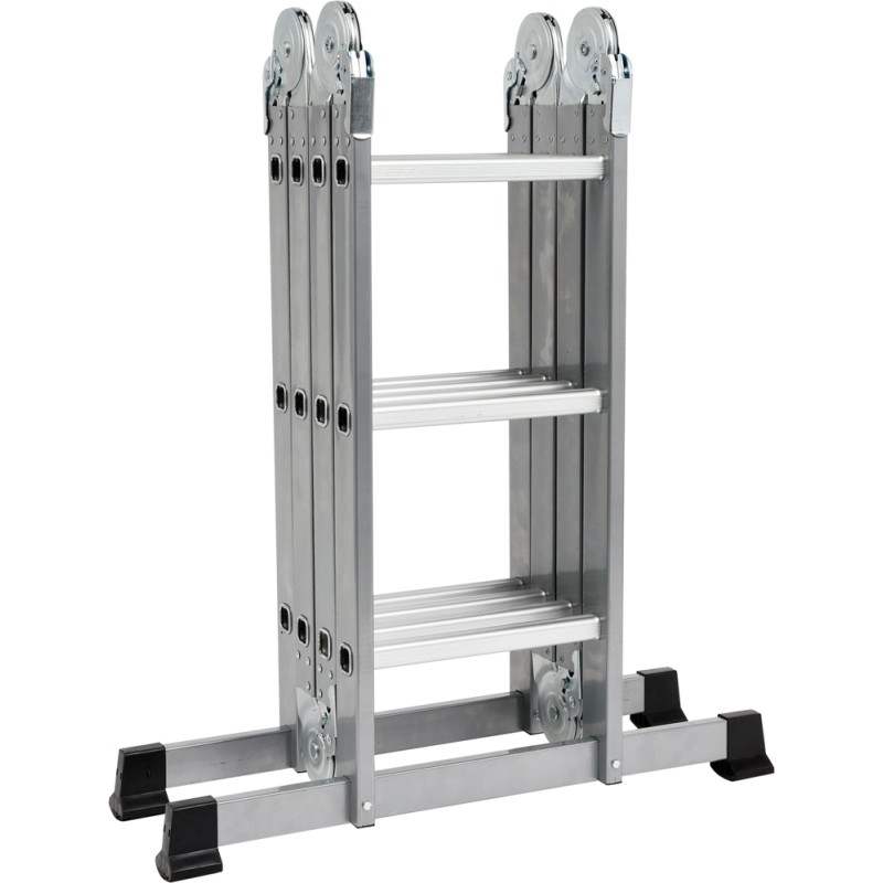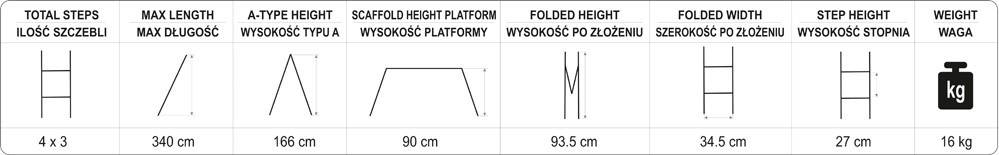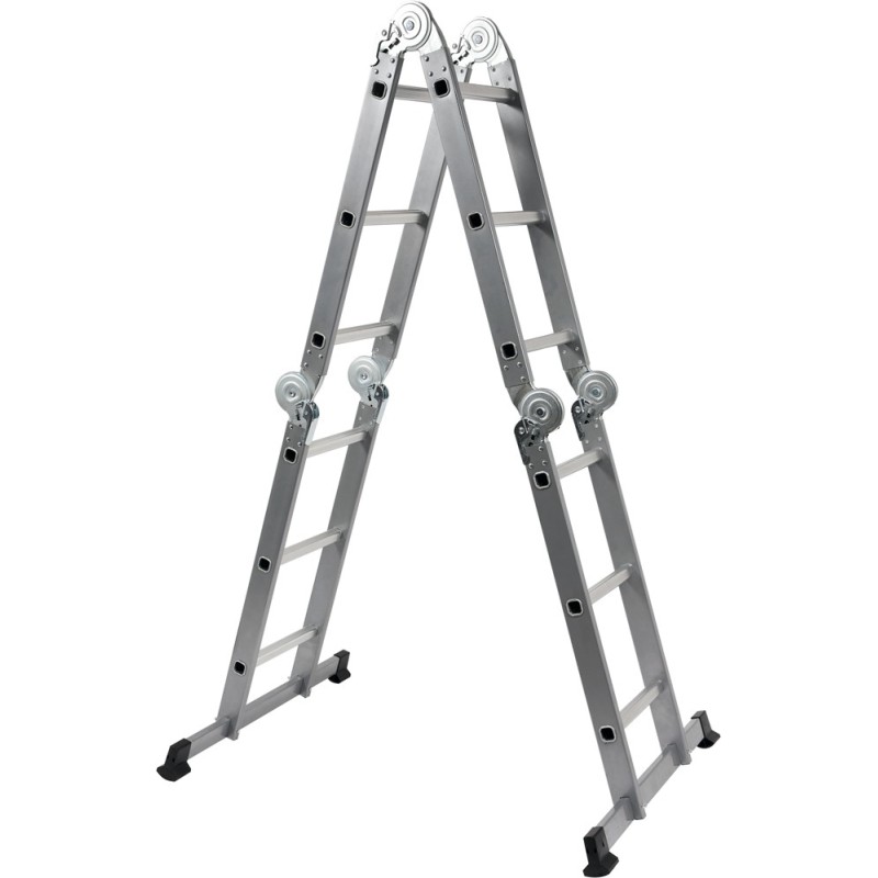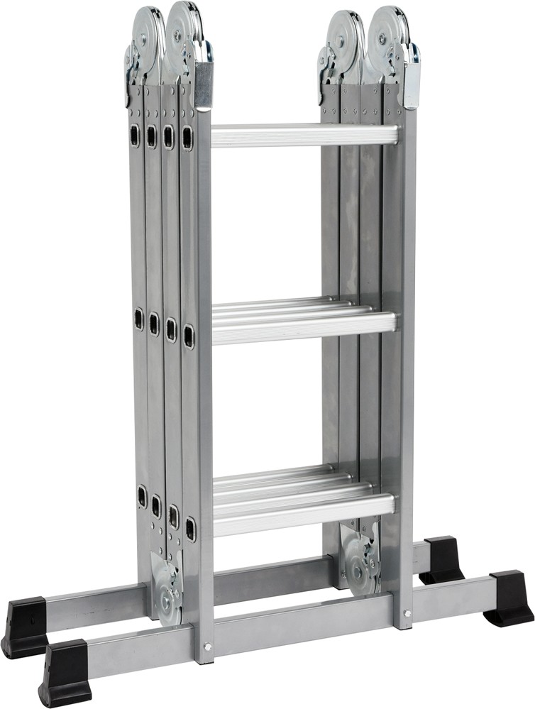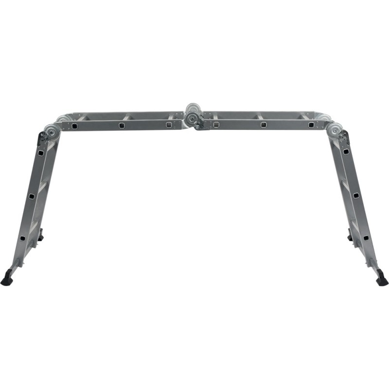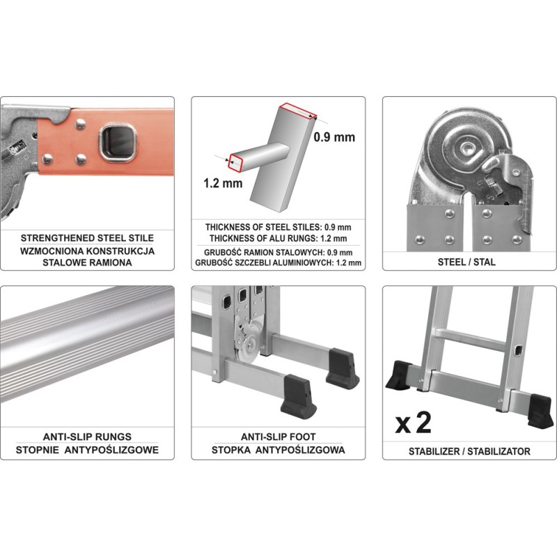 Multifunktionsleiter 4x3 mit einer maximalen Höhe von 3,4 m. Erfüllt die Anforderungen der europäischen Norm PN EN131 mit einer Tragfähigkeit von 150 kg pro Sprosse. Besteht aus vier Segmenten, die durch starke und robuste Gelenke miteinander verbunden sind. Alle Gelenke sind mit Verriegelungen ausgestattet, die eine sehr schnelle und bequeme Anpassung der Leiter an die jeweiligen Anforderungen ermöglichen. Die Längsträger bestehen aus verstärkten Stahlprofilen mit einer Stärke von 0,9 mm, die deutlich stabiler sind als Aluminiumprofile. Dies trägt zu einer deutlich höheren Stabilität und Sicherheit bei und verlängert die Lebensdauer der Leiter. Die Aluminium-Sprossen bestehen aus 1,2 mm starken Profilen, die auf beiden Seiten mit profilierten, rutschfesten Oberflächen versehen sind. Darüber hinaus ist die Leiter mit zwei breiten Stabilisatoren ausgestattet, die die Stabilität und Sicherheit während des Gebrauchs erheblich erhöhen. Jeder Stabilisator verfügt über zwei profilierte rutschfeste Füße, die die Bodenhaftung in jeder Aufstellposition der Leiter verbessern.