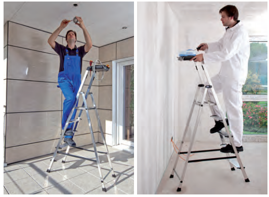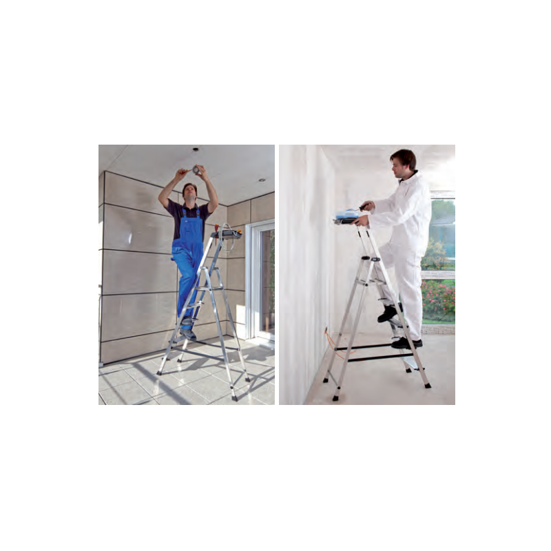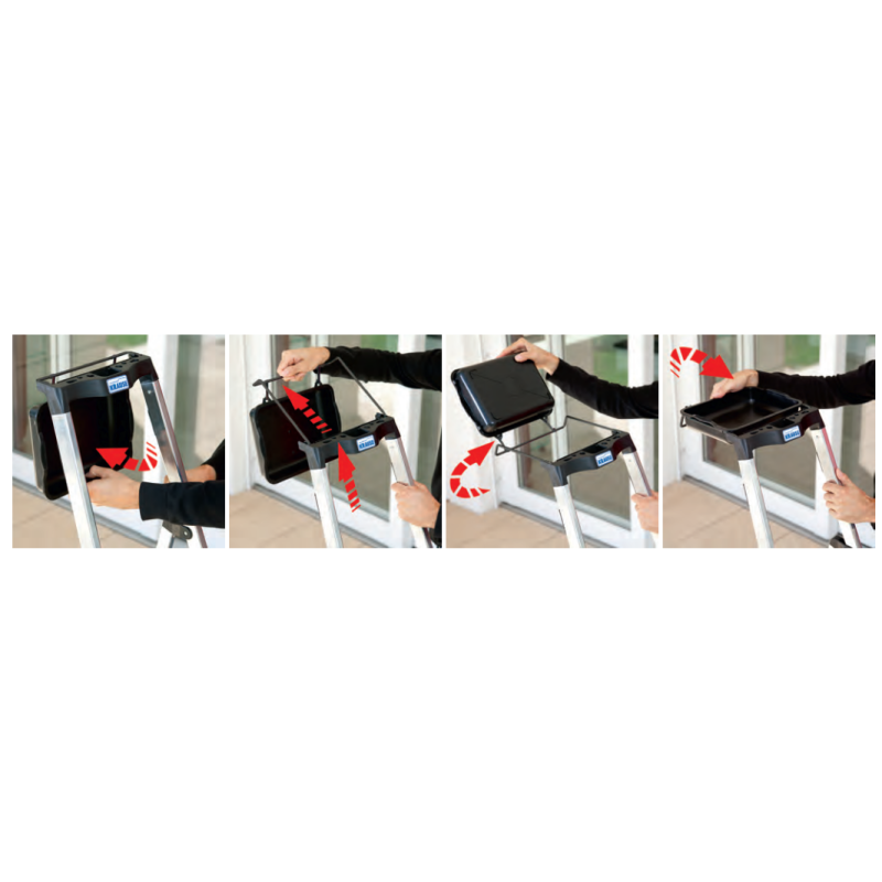 - Kompakte Aluminiumleiter mit großem, ausklappbarem Behälter, der das wiederholte Auf- und Absteigen während der Arbeit reduziert.