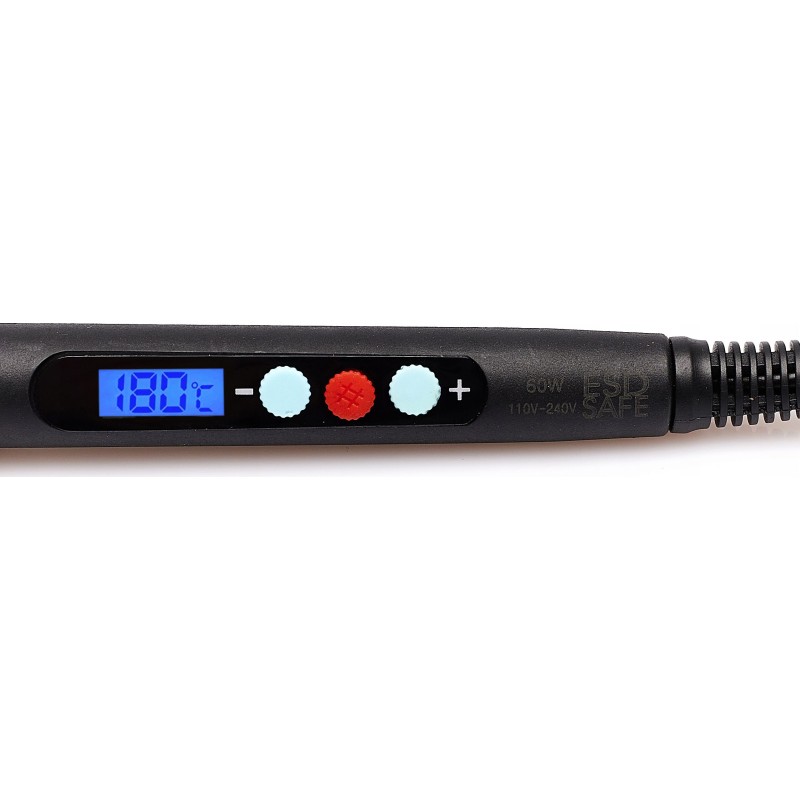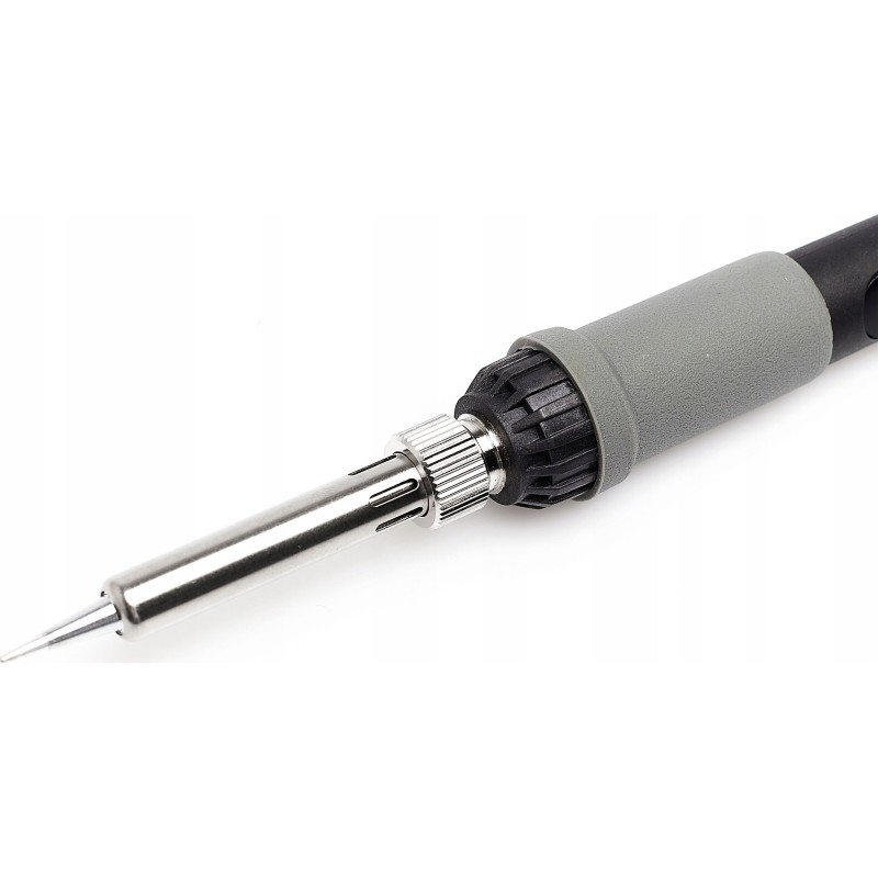 Professioneller, leistungsstarker und präziser 60-W-Lötkolben mit einstellbarer Temperatur im Bereich von 180 °C bis 500 °C, tragbares Gerät mit präzisem Display, das sehr schnell auf die eingestellte Temperatur aufheizt. Der Lötkolben verfügt über eine Temperaturstabilisierung, d. h. die eingestellte Temperatur wird während des Lötvorgangs konstant gehalten.