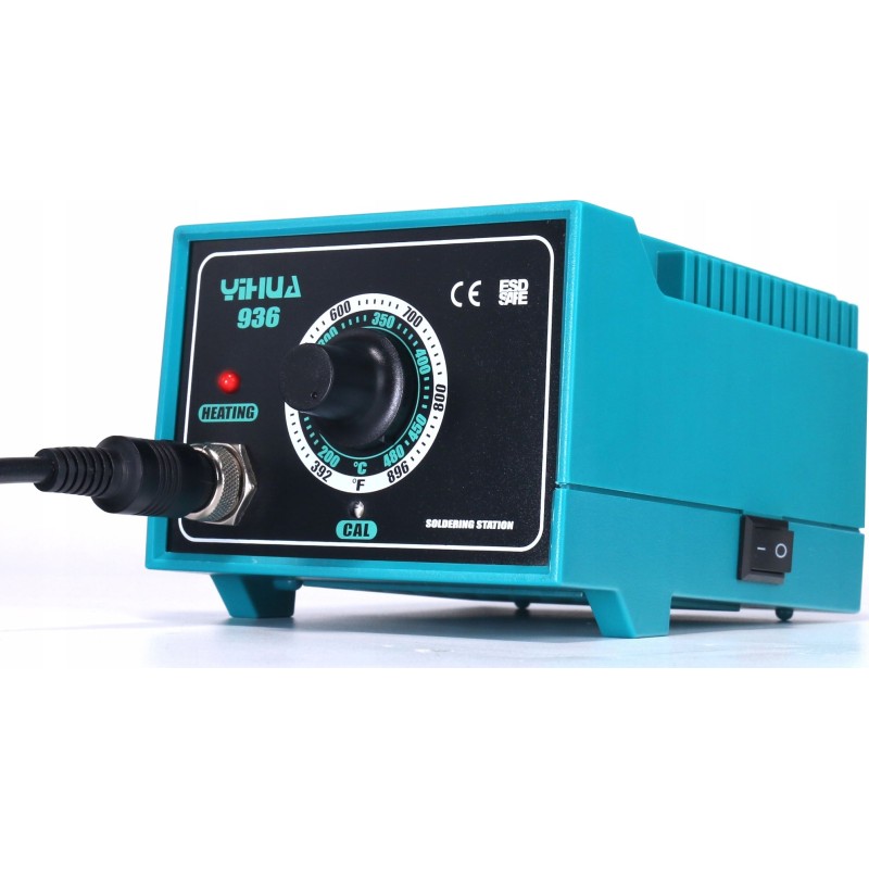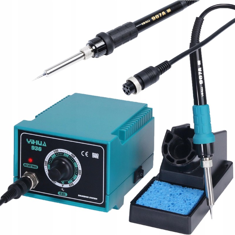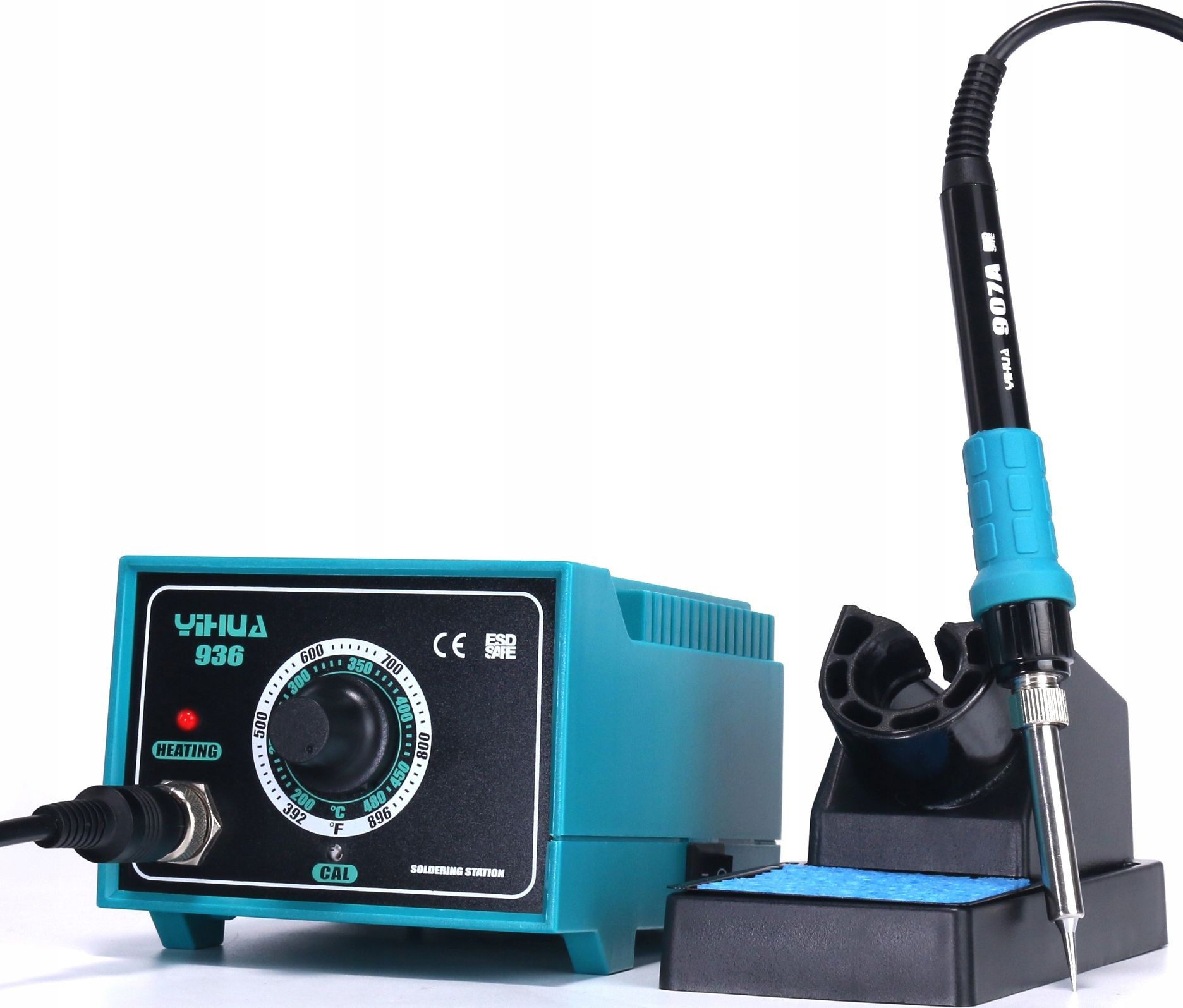Lötstation im Set mit dem Lötkolben 907A mit einer sehr hohen Spitzenleistung von 60 W, dank der die Spitze in kurzer Zeit auf die gewünschte Temperatur erhitzt werden kann. Sie ist außerdem mit einer ESD-Sicherheitsvorrichtung ausgestattet, die sie vor Überhitzung schützt. Das Modell 936 ist das zuverlässigste und bewährteste Modell, ideal für den Hobbygebrauch sowie für kleine Werkstätten – die perfekte Station, um Ihre ersten Schritte im Löten zu machen. Die Station verfügt über eine Temperaturregelung im Bereich von 200 °C bis 480 °C. Der Aufbau der Station ist unkompliziert, weshalb das Gerät praktisch störungsfrei ist. Die Station verfügt über eine Temperaturstabilisierung, d. h. die eingestellte Temperatur wird während des Lötvorgangs konstant gehalten.