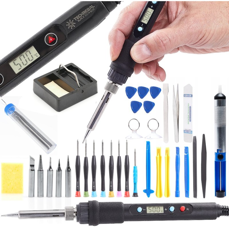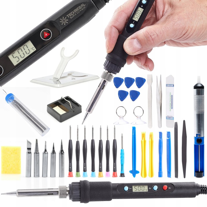 Im Lieferumfang des Lötkolbens ist alles enthalten, was für effizientes Löten erforderlich ist. Neben dem Lötkolben selbst erhält der Anwender fünf Universal-Lötspitzen, einen Spitzenreiniger, einen Lötkolbenständer sowie Techrebal-Lötzinn. Darüber hinaus enthält das Set einen kostengünstigen Absauger sowie Werkzeuge für die Reparatur von Mobiltelefonen, was es zu einer umfassenden Lösung für Lötarbeiten macht.