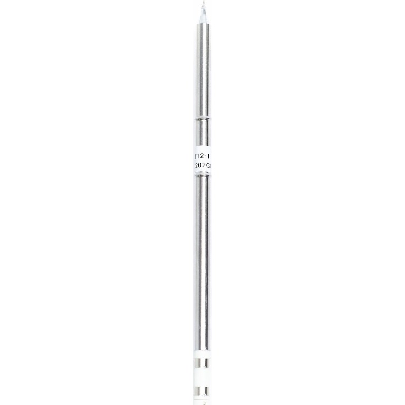 Wie auf der nebenstehenden Abbildung zu sehen ist, sind die Spitzen der Serie T-12 mit einem Heizelement und einem Temperatursensor integriert. Somit bilden das Heizelement und die Lötspitze ein einziges Bauteil, das als Spitze bezeichnet wird. Bitte beachten Sie, dass der Temperatursensor (Thermoelement) sehr nahe an der Lötspitze der Spitze angebracht ist, was eine sehr genaue Temperaturmessung während des Lötvorgangs gewährleistet. Die Spitzen der Serie T12 zeichnen sich durch eine schnelle Aufheizzeit aus (Erreichen einer Temperatur von 300 °C in weniger als 30 Sekunden). Die Spitze ist mit elektrischen Kontakten versehen. Im Lötkolben wird die T12-Spitze per Schnappverschluss befestigt. Die kompakte Bauweise der T12-Spitzen ermöglicht ihren Austausch im heißen Zustand (unter Verwendung einer hitzebeständigen Unterlage, mit der die heiße Spitze angefasst wird).