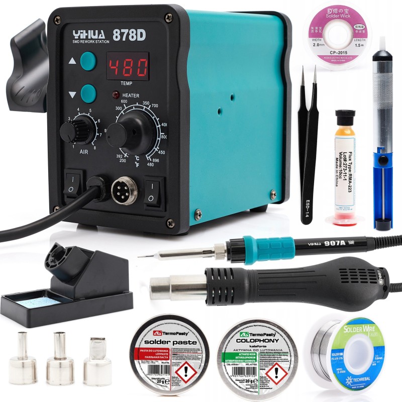 Im Lieferumfang ist alles enthalten, was zum Löten benötigt wird: eine Lötkolben-Spitze Modell 907A, ein Heißluftkolben, Halterungen für beide Kolben, 3 austauschbare Düsen, Techrebal S-058-Lötzinn, ein Lötzinnabsauger, RMA-223-Gel-Flussmittel, Kolophonium, Lötpaste sowie eine ESD-14-Pinzette. Damit hat der Anwender alles, was er braucht, um sofort nach dem Kauf mit der Arbeit zu beginnen.