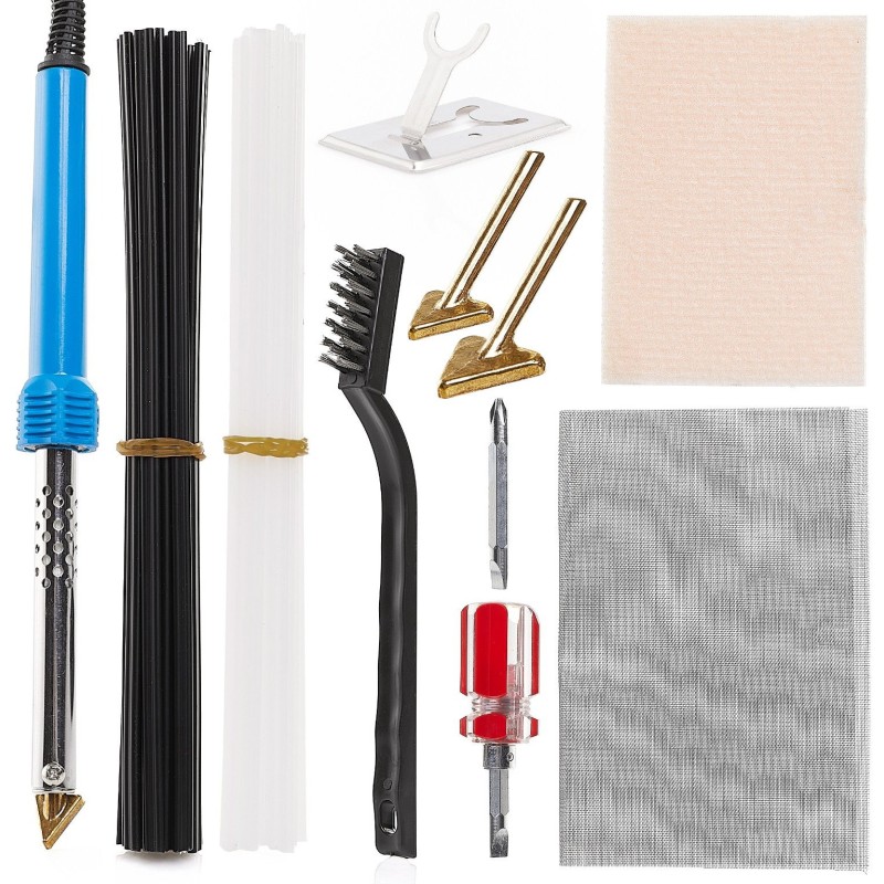 Zum Set gehört auch ein Kunststoffschweißset, das 9 Teile umfasst, darunter einen Lötkolben sowie ein flexibles Schweißnetz. Diese umfassende Lösung ermöglicht das einfache und effektive Verbinden von Kunststoffmaterialien.