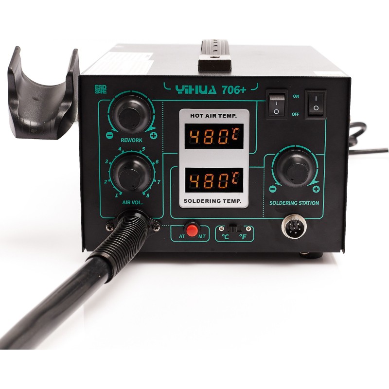Technische DatenDie Yihua 706+ zeichnet sich durch eine hohe Spitzenleistung von 640 W und eine maximale Leistungsaufnahme von 700 W aus. Sie verfügt über zwei Displays, die die tatsächliche Temperatur für beide Systeme anzeigen. Das Gerät bietet den höchsten Luftdurchsatz auf dem Markt von 168 l/min, was eine effektive Kühlung und ein effizientes Löten ermöglicht.