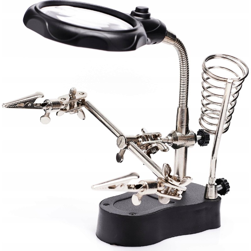 Dritte Hand mit Lupe, LED-Beleuchtung und Halterung für den Lötkolben – ZD-126-2. Die Lupe mit Arbeitsbereichsbeleuchtung und der Halter für den Lötkolben erleichtern die Arbeit erheblich. Im Set enthalten sind eine verstellbare Lupe mit Vergrößerungslinse und integrierter LED-Beleuchtung. Sie kann von Juwelieren, Numismatikern, Elektronik-Servicetechnikern, Uhrmachern usw. verwendet werden. Ein ideales Set für elektronische und elektrische Arbeiten.