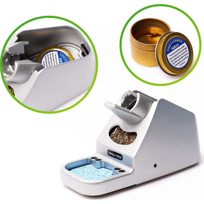 - Halterung für die Lötkolben-Spitze mit Reinigungsschwamm und Reinigungswerkzeug