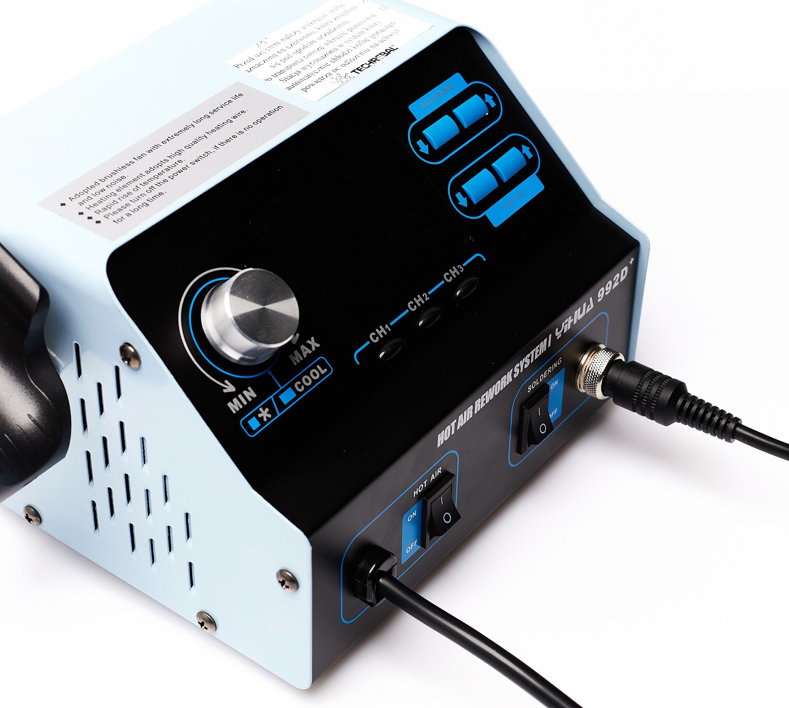 - Heißluft, zum Auslöten und Einlöten von elektronischen Bauteilen, z. B. BGA, SMD usw. Der Luftstrom in der Station wird durch einen Ventilator erzeugt.