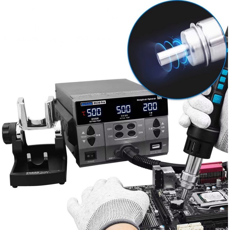 Der Sugon 8630 Pro ist eine Heißluft-Lötstation, die sich an viele verschiedene Anforderungen anpasst – von Reparaturen und Wartungsarbeiten bis hin zu komplexeren Arbeiten mit SMD- und BGA-Bauteilen. Dank der Einstellbarkeit von Temperatur und Heißluftstärke eignet sich das Gerät sowohl für empfindliche als auch für anspruchsvollere Aufgaben. Diese Vielseitigkeit ermöglicht die Auswahl der für die jeweilige Aufgabe idealen Parameter und erhöht so die Präzision und Arbeitssicherheit. Der Sugon 8630 Pro bietet volle Flexibilität und ermöglicht mit einem einzigen Gerät ein breites Spektrum an elektronischen Reparaturen.