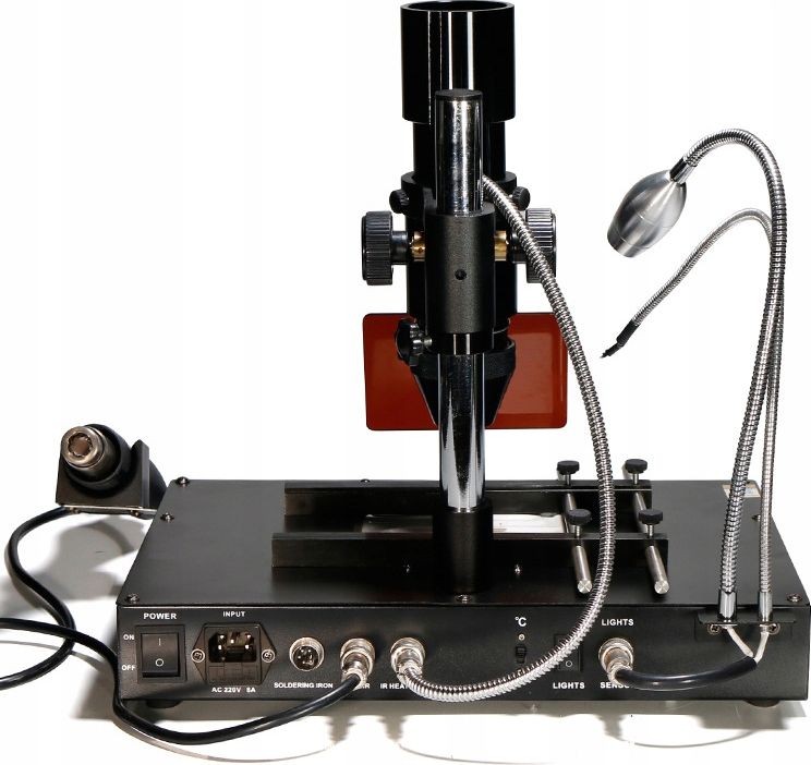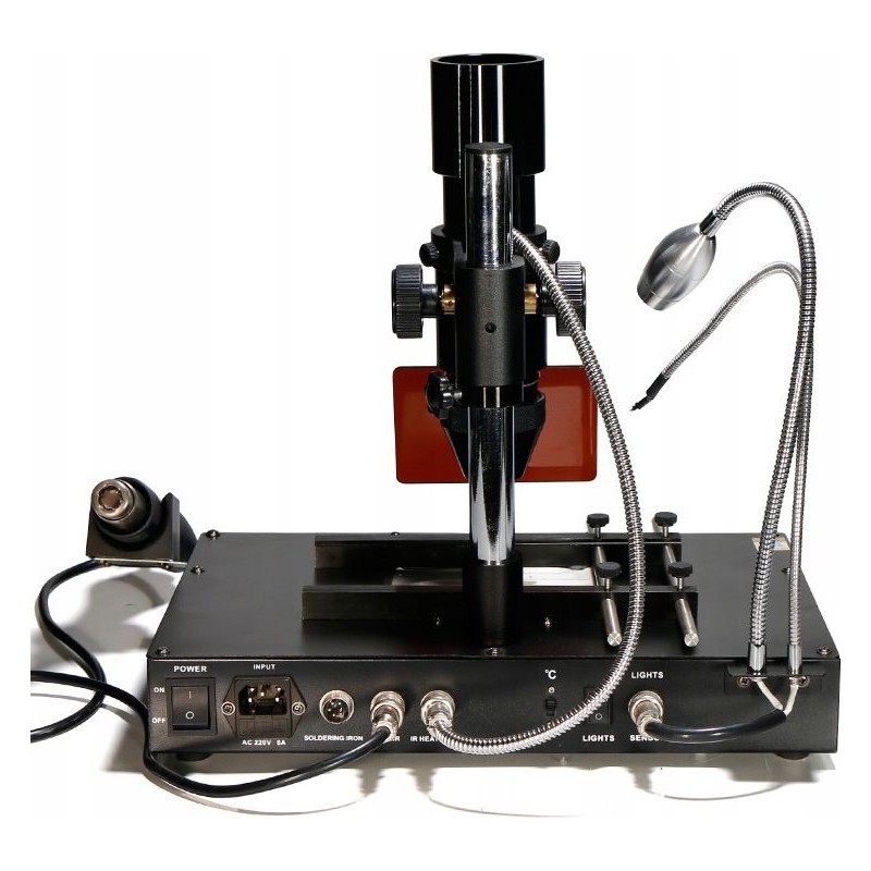 Ein neues Modell einer Lötstation, das die neueste auf dem Markt verfügbare Technologie nutzt. Ausgestattet mit einem Samsung-Prozessor zur Temperaturregelung. Die Station vereint vier Heißluftfunktionen in einem Gerät. Heißluft kann zum Entlöten von Bauteilen mit schwacher Infrarotempfindlichkeit verwendet werden. Die Station nimmt nur wenig Arbeitsfläche ein, was ein weiterer Vorteil ist, und eignet sich ideal für den professionellen Service. Dank der benutzerfreundlichen Konstruktion, die Infrarotstrahlung zum Entlöten nutzt, sowie der neuesten Sicherheitssonde zur Echtzeit-Überwachung der Temperaturen und der Oberflächenentladungen des ICs verhindert sie thermische Schäden an den zu entlötenden Bauteilen, unabhängig von den Fähigkeiten des Anwenders. Der Heißluftkolben nutzt eine mikroprozessorgesteuerte PID-Regelung mit einer 100-ms-Echtzeit-Verfolgung der Temperaturen am Auslass der Druckluftpistole und der Lötkolbenspitze; dank der Echtzeitanzeige sind die Temperaturen äußerst stabil. Das Handgriffkabel besteht aus einem hochtemperaturbeständigen Silikonkabel (beständig bis 300 Grad, wenn die Lötspitze 30 Sekunden lang mit dem Silikonkabel in Kontakt kommt); Der Heizkörper nutzt ein Hochleistungsheizelement für eine schnelle Temperaturkompensation und eignet sich insbesondere zum Entlöten von verschmutzten Stellen, großen Verbindungen und schwer zugänglichen Stellen. Das Gerät verfügt über einen Temperaturkompensationsbereich von -50 °C bis +50 °C. Das Infrarotlicht verfügt über eine Leistungsregelung von 5 bis 80. Um der Marktnachfrage in verschiedenen Regionen gerecht zu werden, hat das Unternehmen einen Temperaturanzeigemodus in Celsius/Fahrenheit entwickelt