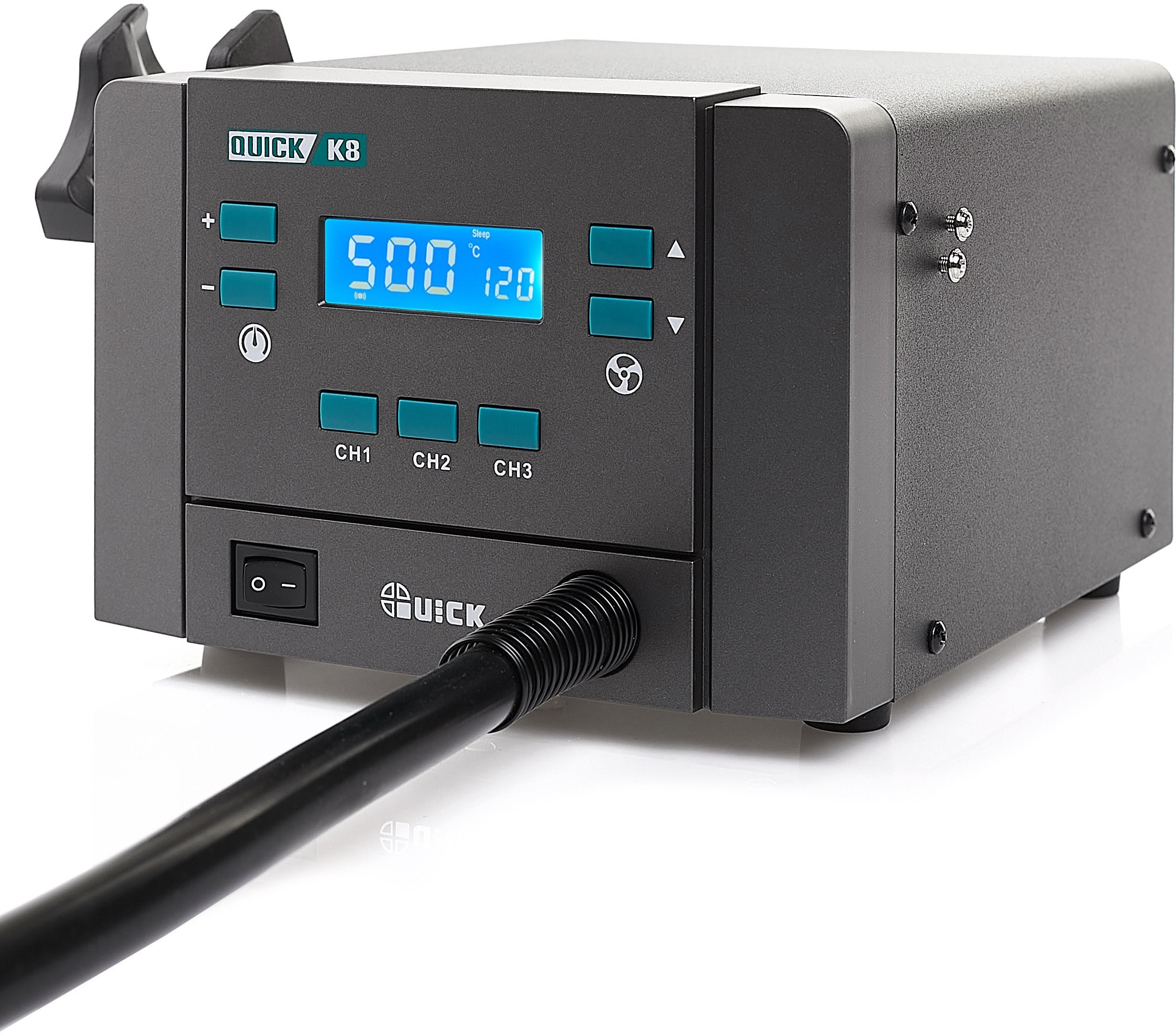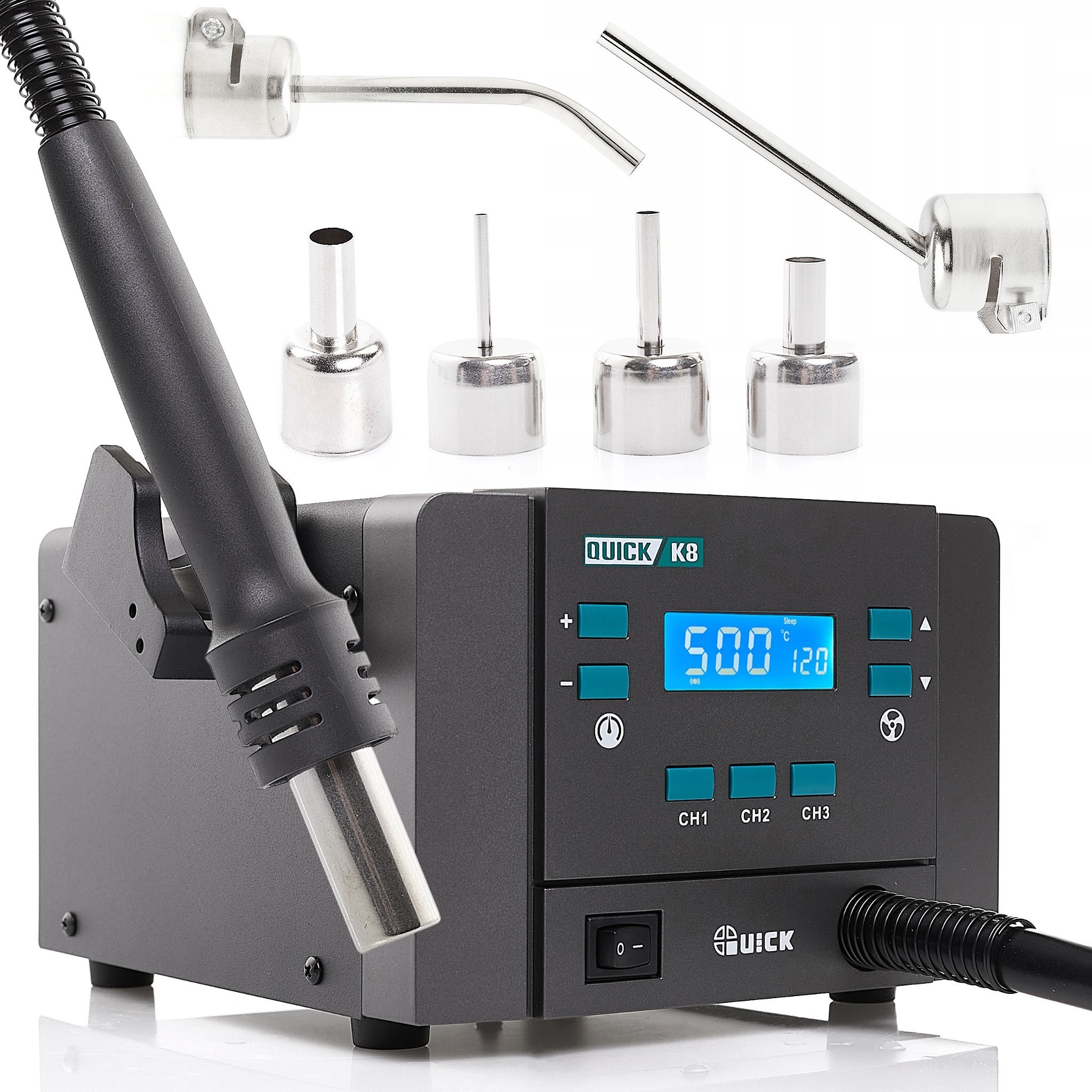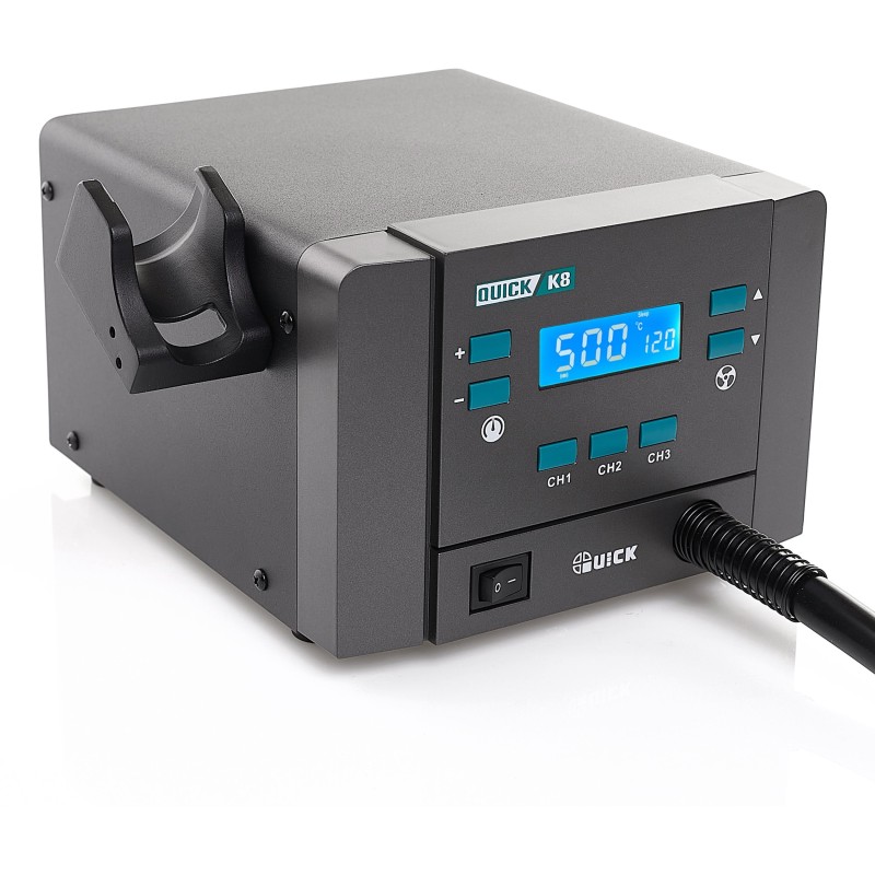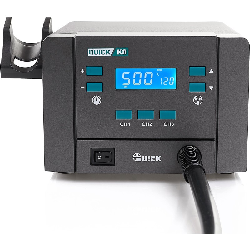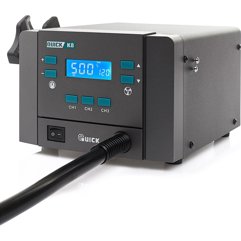 Mit dem Quick K8 lässt sich die Temperatur präzise im Bereich von 100 bis 500 °C einstellen und der Luftstrom von 1 bis 120 l/min regulieren. Dank drei unabhängiger Kanäle (CH1, CH2, CH3) kann der Anwender schnell zwischen verschiedenen Einstellungen wechseln, was die Arbeitseffizienz erheblich steigert.