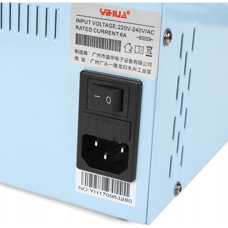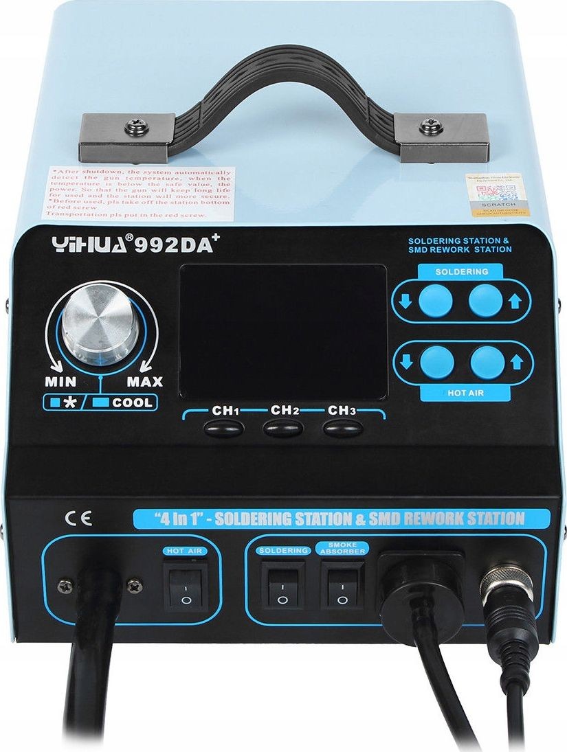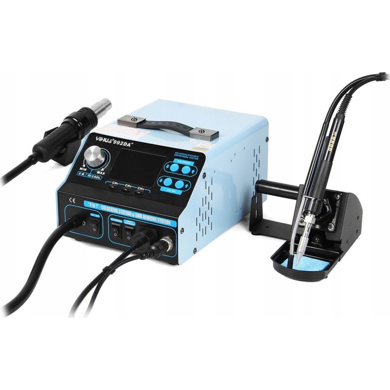 Das Gerät Yihua 992DA+ ist eine Heißluft-Lötstation (Hotair) sowie ein Lötkolben (75 W) und wird zum Löten und Entlöten von elektronischen Bauteilen verwendet. Die Station ist mit einem Mikroprozessor mit präzisem PID-Regler ausgestattet, der die Betriebsparameter überprüft und auf die vorgegebenen Werte korrigiert.