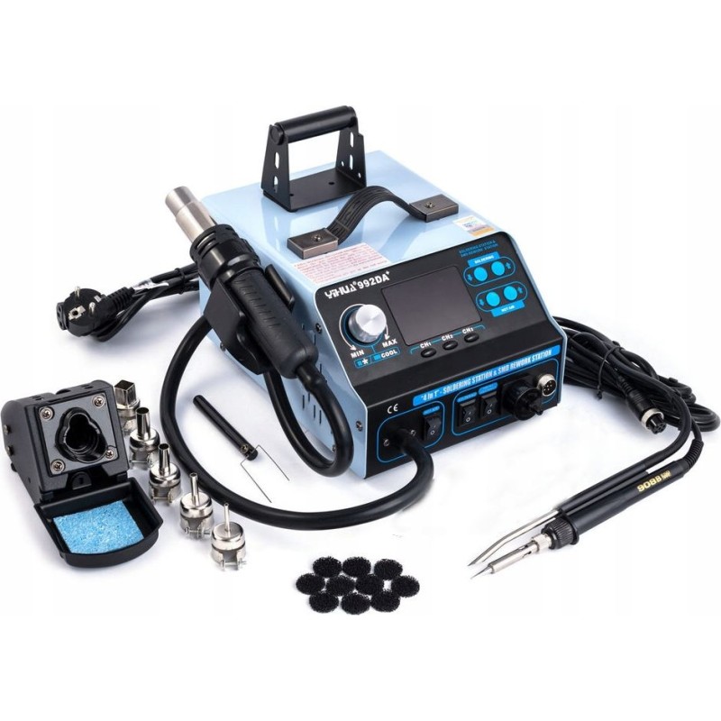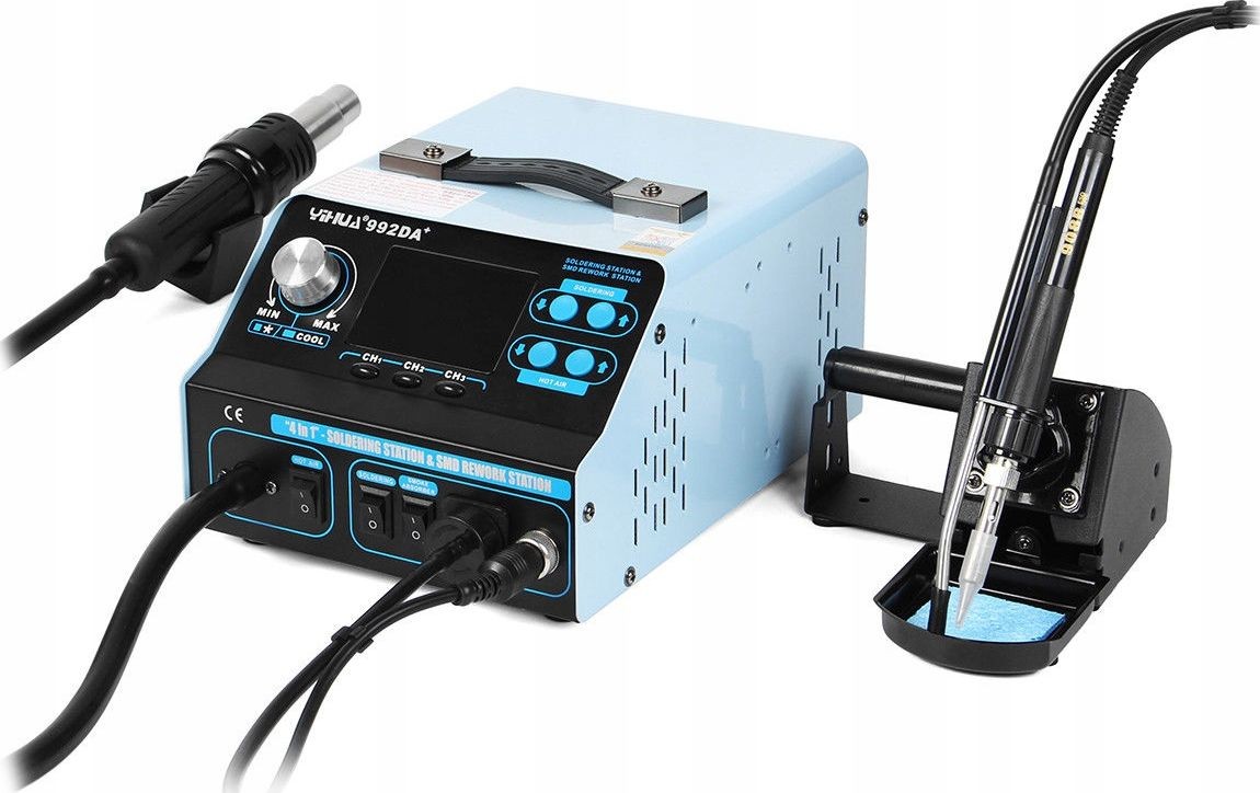 Das Gerät Yihua 992DA+ ist eine Heißluft-Lötstation (Hotair) sowie ein Lötkolben (75 W) und wird zum Löten und Entlöten von elektronischen Bauteilen verwendet. Die Station ist mit einem Mikroprozessor mit präzisem PID-Regler ausgestattet, der die Betriebsparameter überprüft und auf die vorgegebenen Werte korrigiert