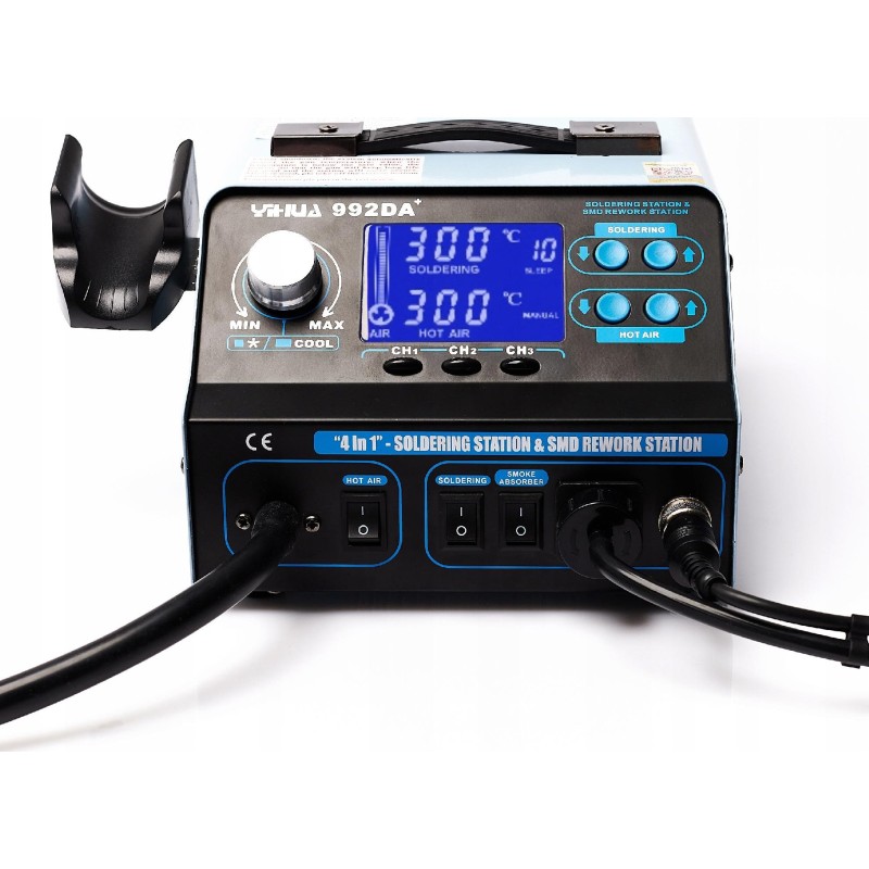Das Gerät Yihua 992DA+ ist eine Heißluft-Lötstation (Hotair) sowie ein Lötkolben (75 W) und wird zum Löten und Entlöten von elektronischen Bauteilen verwendet. Die Station ist mit einem Mikroprozessor mit präzisem PID-Regler ausgestattet, der die Betriebsparameter überprüft und auf die vorgegebenen Werte korrigiert.