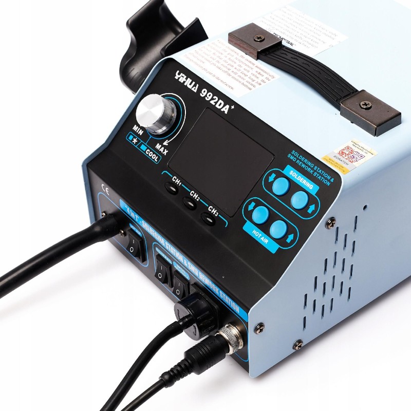 Das Gerät Yihua 992DA+ ist eine Heißluft-Lötstation (Hotair) sowie ein Lötkolben (75 W) und wird zum Löten und Entlöten von elektronischen Bauteilen verwendet. Die Station ist mit einem Mikroprozessor mit präzisem PID-Regler ausgestattet, der die Betriebsparameter überprüft und auf die vorgegebenen Werte korrigiert.