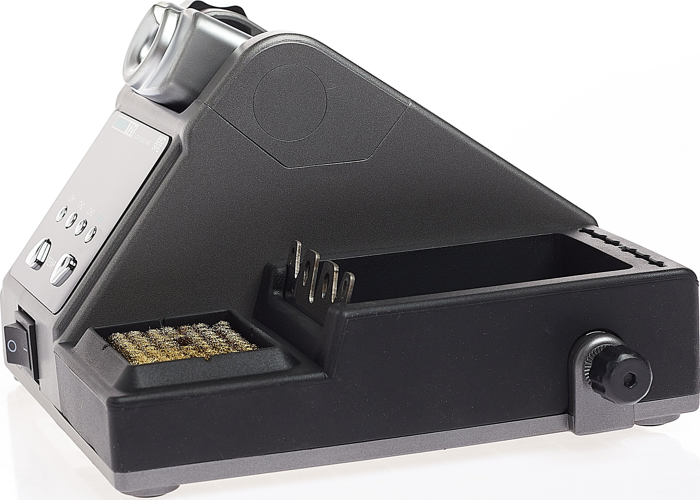 - Seitliche Montage: Die Halterung kann an der Seite der Lötstation montiert werden, was die Flexibilität erhöht und es ermöglicht, ihre Position an die individuellen Vorlieben des Benutzers anzupassen.