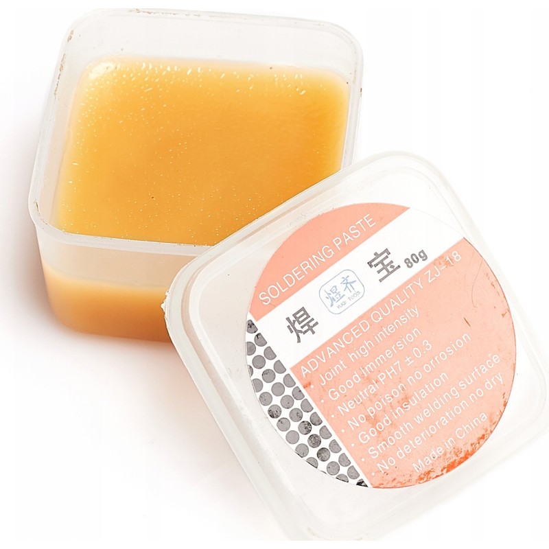 Hochwertige Lötpaste, leicht zu verteilen, mit hoher Benetzungsfähigkeit der Lötflächen. Beeinträchtigt die Eigenschaften von IC- und PCB-Bauteilen nicht, korrodiert nicht und erfordert keine Reinigung. Ihr Siedepunkt liegt geringfügig über dem Schmelzpunkt des Lötzinns. Sie hat eine gelartige Konsistenz, was ihre Anwendung erleichtert.