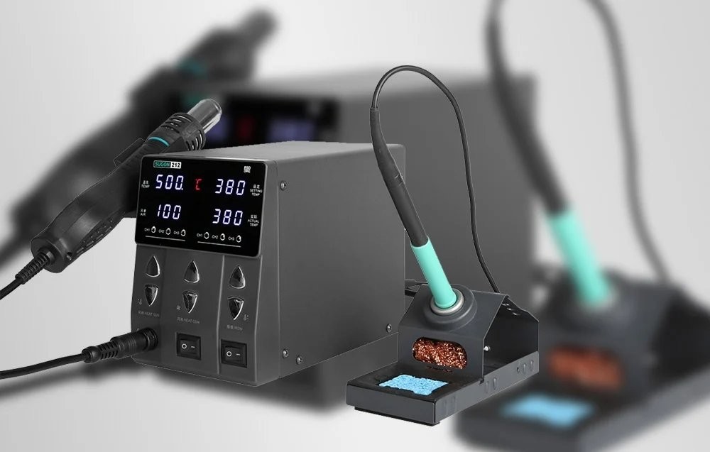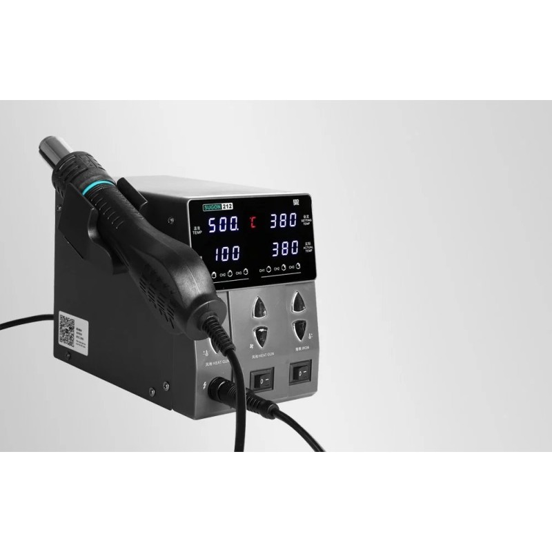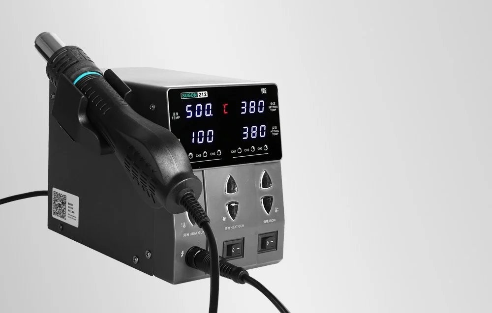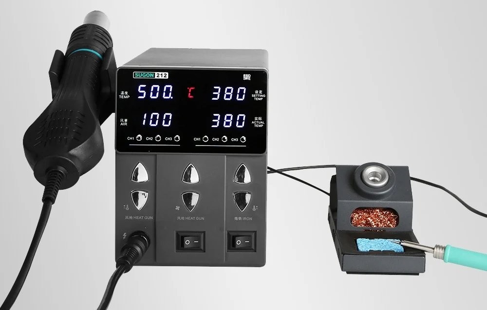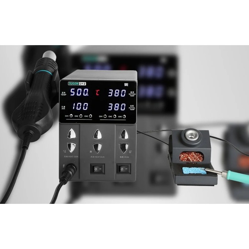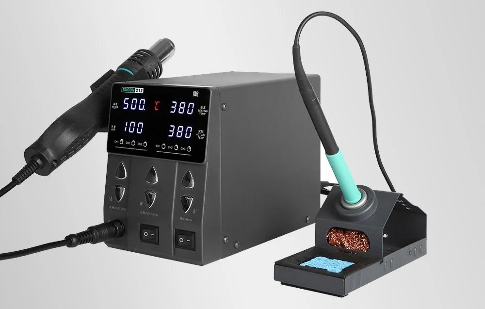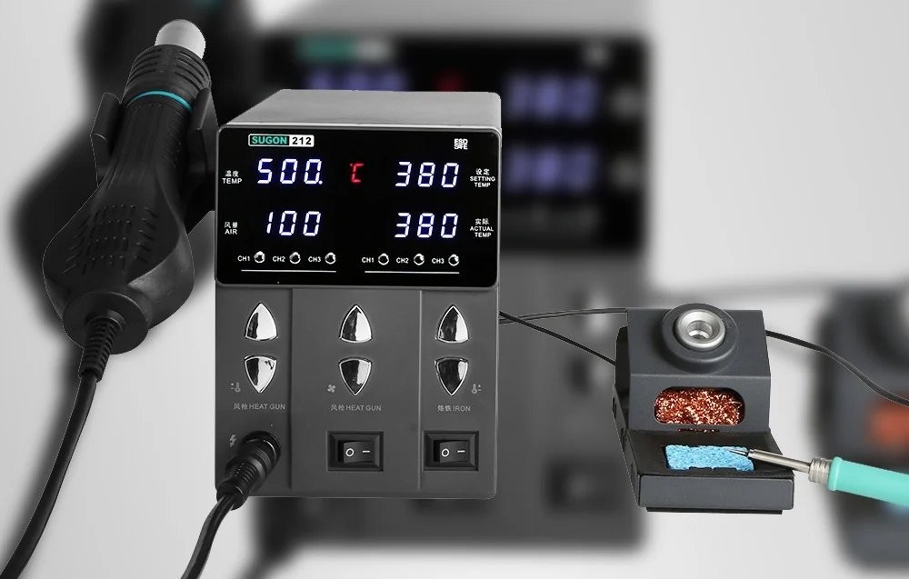 Die Lötstation SUGON 212 vereint die Funktionen eines Lötkolbens und eines Heißluftgeräts, wodurch wertvoller Platz am Arbeitsplatz gespart wird. So können Anwender den vollen Funktionsumfang nutzen, ohne zwei separate Geräte anschaffen zu müssen.