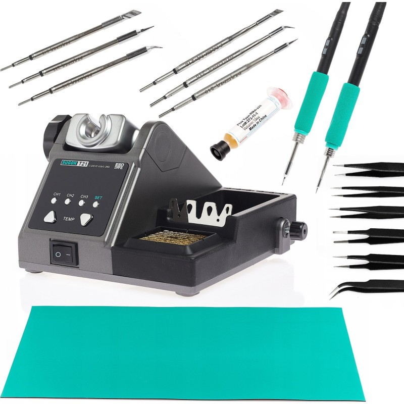 Set: Lötstation Sugon T21 T245+T210 + ESD-Reparaturmatte 25x50 cm + Set mit 6 Pinzetten + Flussmittel RMA-223 10 ml