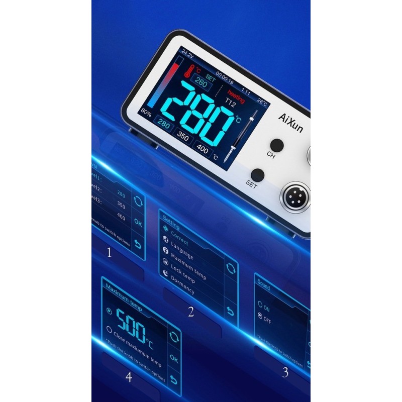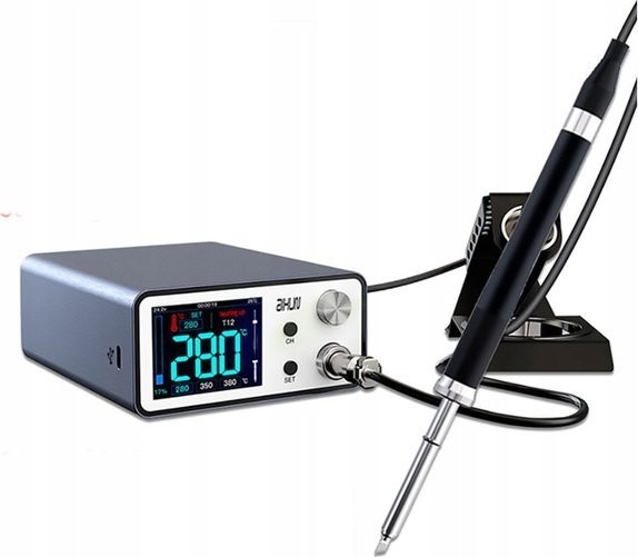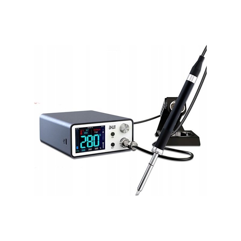 Merkmale und FunktionenDie Lötstation bietet umfangreiche Kalibrierungsmöglichkeiten sowie einen schnellen „Heißwechsel“ der Lötspitzen. Sie ist mit einem großen, gut lesbaren 2,4-Zoll-Farbdisplay ausgestattet, das Temperatur, Betriebsmodus und Leistung anzeigt. Die Software kann auf die neueste Version aktualisiert werden.