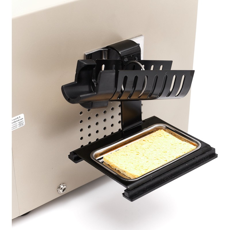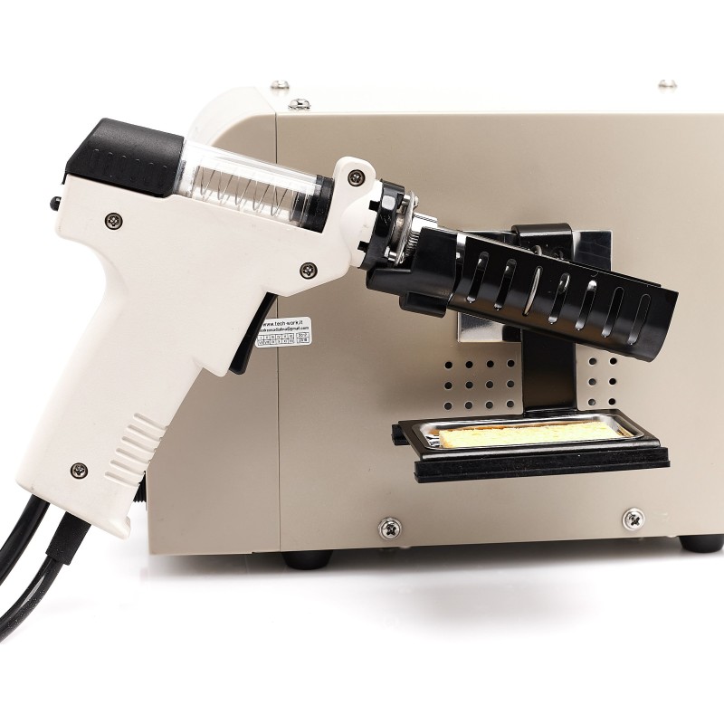 Lötstation zum Entfernen von elektronischen Bauteilen von Leiterplatten (PCB). Die Station verfügt über einen eingebauten Kompressor, der beim Betätigen des Pistolenabzugs startet und einen Unterdruck erzeugt. Im Vergleich zu herkömmlichen Absauggeräten ist sie komfortabler und ermöglicht schnelleres Arbeiten – sie erhitzt das Zinn selbst. Die Zentraleinheit ist mit einem großen und gut lesbaren LCD-Display mit Hintergrundbeleuchtung ausgestattet, das den eingestellten Temperaturwert sowie die am Lötspitzenmessfühler gemessene (abgelesene) Temperatur anzeigt. Die Temperatur ist in Schritten von 1 °C im Bereich von 160 °C bis 480 °C einstellbar. Das leistungsstarke 90-W-Heizelement bewältigt viele schwierige Fälle.