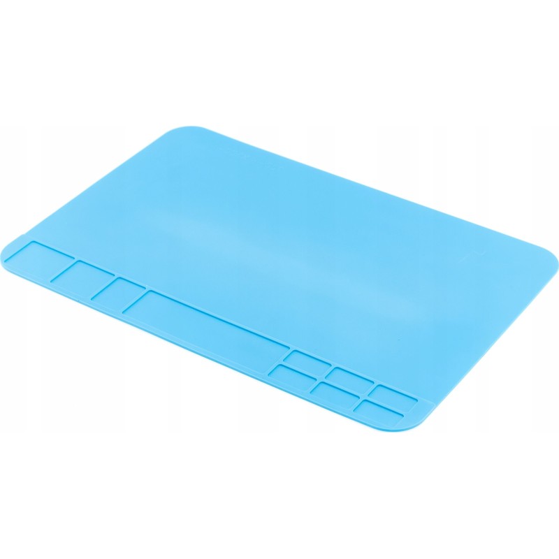 Hochwertige Silikonmatte mit profilierten Fächern, die den Arbeitskomfort in jeder Werkstatt verbessert. Die antistatischen Eigenschaften und die speziellen Fächer ermöglichen die Organisation und Sortierung von elektronischen Bauteilen, Schrauben usw. während der Arbeit. Die große, flache Oberfläche und die hohe Temperaturbeständigkeit ermöglichen das Löten von Platinen und Bildschirmen direkt auf der Matte. Die Matte ist beständig gegen sehr hohe Temperaturen bis zu 500 °C und ermöglicht das Löten direkt auf der Matte. Sie ist mit mehreren verschiedenen Fächern ausgestattet, in denen z. B. Schraubendreher, Schrauben, Flussmittel, Zinn und andere kleine, im Servicebereich verwendete Teile untergebracht werden können. Sie eignet sich ideal für Werkstätten, die sich mit der Reparatur von Mobiltelefonen, Tablets und Computern befassen, sowie für andere Bereiche, in denen eine solide, hochtemperaturbeständige Antistatikmatte benötigt wird. Die Matte kann mit Wasser, Isopropylalkohol oder einer anderen Reinigungsflüssigkeit für Leiterplatten gereinigt werden. Die Matte ist mit Organizerfächern ausgestattet, die es ermöglichen, den Arbeitsplatz perfekt in Ordnung zu halten – alle Schrauben und andere Metallteile befinden sich an einem Ort.