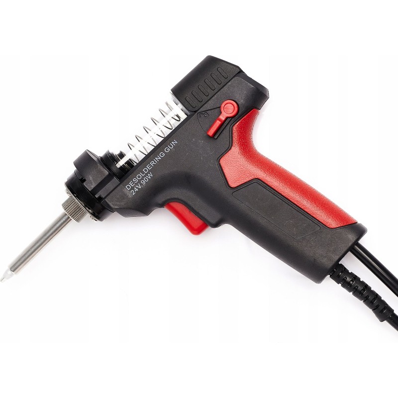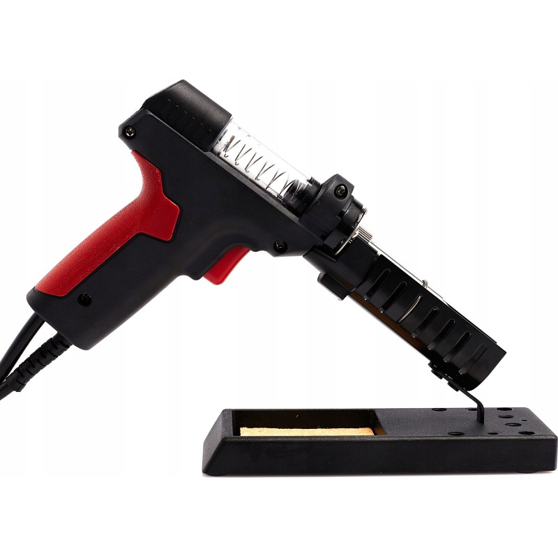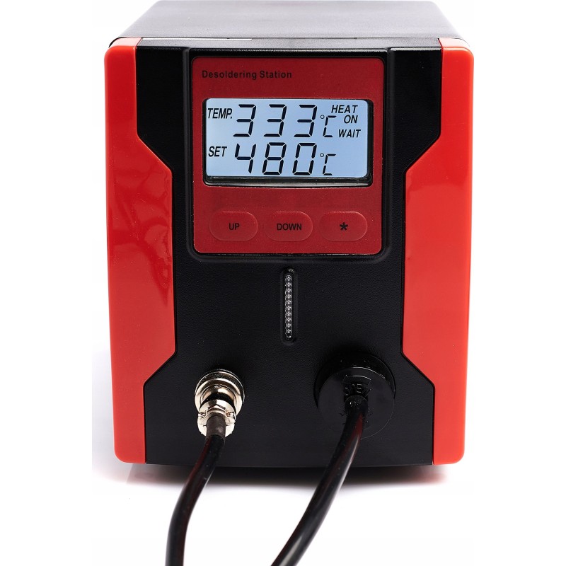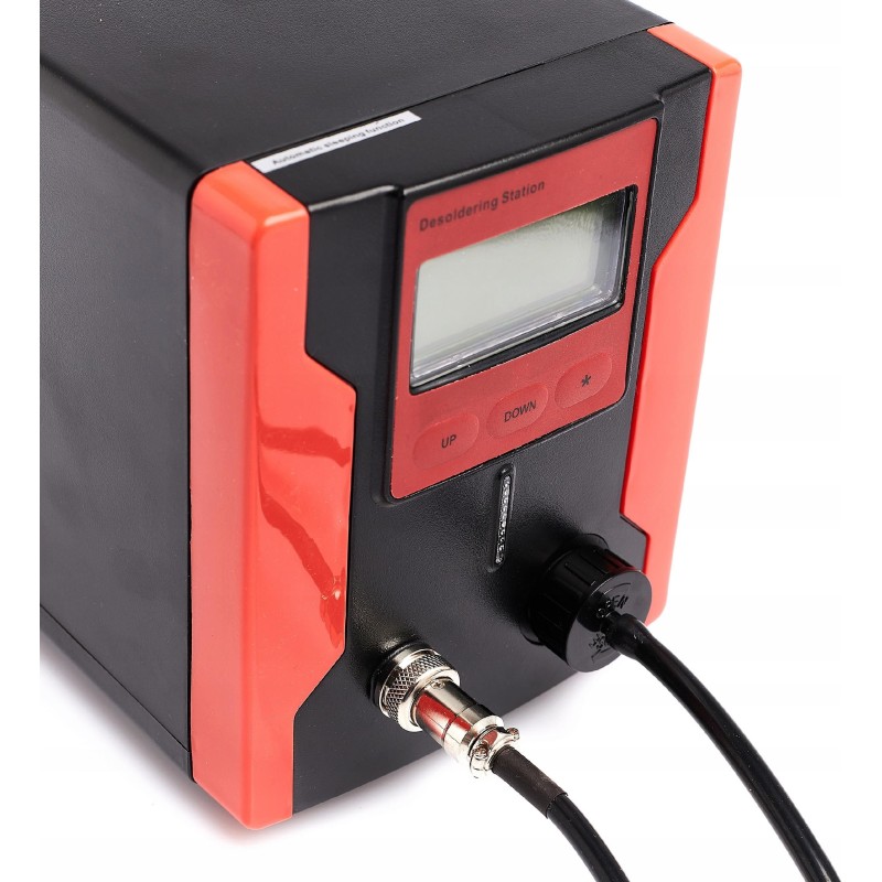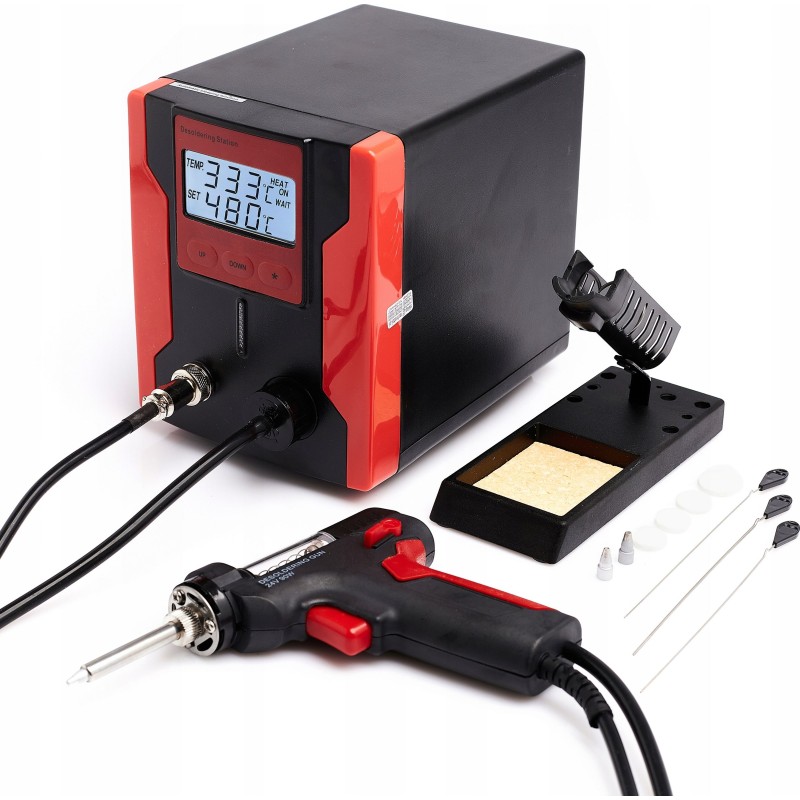 Lötstation zum Entfernen von elektronischen Bauteilen von Leiterplatten (PCB). Die Station verfügt über einen eingebauten Kompressor, der beim Betätigen des Pistolenabzugs startet und einen Unterdruck erzeugt. Im Vergleich zu herkömmlichen Absauggeräten ist sie komfortabler und ermöglicht ein schnelleres Arbeiten – sie erhitzt das Zinn selbst. Die Zentraleinheit ist mit einem großen und gut lesbaren LCD-Display mit Hintergrundbeleuchtung ausgestattet, das sowohl die eingestellte Temperatur als auch die an der Lötspitze gemessene (abgelesene) Temperatur anzeigt. Die Temperatur ist in Schritten von 1 °C im Bereich von 160 °C bis 480 °C einstellbar. Die Station verfügt über eine Sleep-Funktion, die die Lebensdauer des Heizelements verlängert: Wenn die Lötpistole 15 Minuten lang nicht benutzt wird, kühlt der Kolben automatisch auf 200 °C ab; sobald der Kolben angehoben wird, erfolgt eine erneute Aufheizung auf die eingestellte Temperatur. Das leistungsstarke 90-W-Heizelement bewältigt viele schwierige Fälle. Die Station ist aus hochwertigen Materialien gefertigt und sieht in ihrer roten Farbe phänomenal aus.