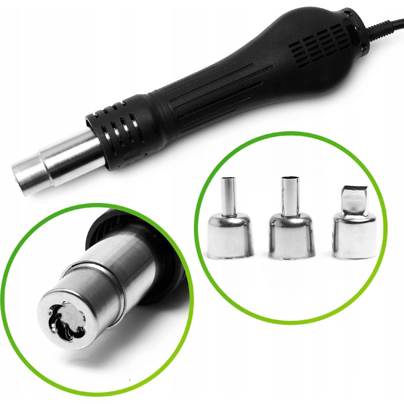 Beide Module der Station, also der Lötkolben und der Heißluftfön, können unabhängig voneinander betrieben werden. Die Station ist zusätzlich mit einem automatischen Kühlsystem nach Beendigung des Betriebs ausgestattet. Dies verlängert auf effektive Weise die Lebensdauer des Heizelements. Dank der hohen Leistung von 60 W und der schnellen Aufheizgeschwindigkeit eignet sich die Lötstation neben dem Bleilöten auch für das bleifreie Löten (Lead Free). Die Station verfügt über ein robustes Metallgehäuse. Die Luftzufuhr erfolgt über einen Lüfter, wodurch ein langlebiger, störungsfreier Betrieb mit konstanter Luftstromstärke gewährleistet ist und ein sehr leiser Betrieb sichergestellt wird. Der Griff der Station ist klein und komfortabel in der Handhabung. In der Station kommen gängige Lötspitzen zum Einsatz, sodass eine von über 30 verschiedenen Spitzenmodellen verwendet werden kann.