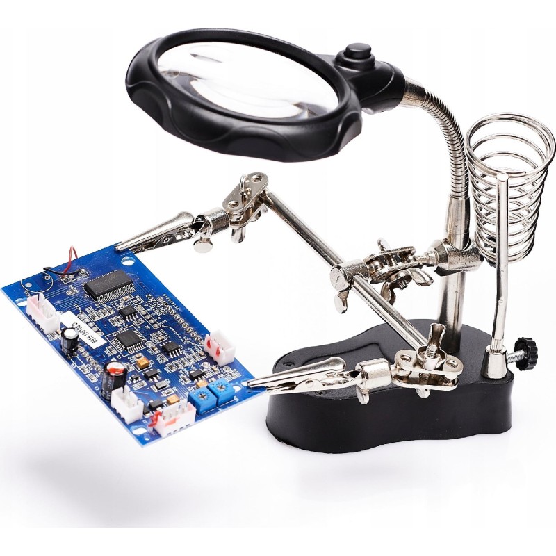 Dritte Hand mit Lupe, LED-Beleuchtung und Halterung für Lötkolben – ZD-126-2. Die Lupe mit Arbeitsbereichsbeleuchtung und der Halter für den Lötkolben erleichtern die Arbeit erheblich. Im Set enthalten sind eine verstellbare Lupe mit Vergrößerung sowie eine integrierte LED-Beleuchtung. Sie kann von Juwelieren, Numismatikern, Elektronik-Servicetechnikern, Uhrmachern usw. verwendet werden. Ein ideales Set für elektronische und elektrische Arbeiten.