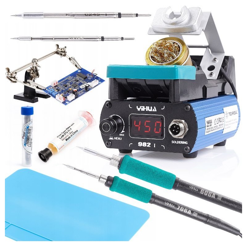 Set mit zuverlässigen Lötwerkzeugen 982 + Antistatische Silikonmatte 380 x 210 mm + Lötzinn 10 g + Montagehalterung + Kolophonium für Lötspitzen + Flussmittel RMA-223