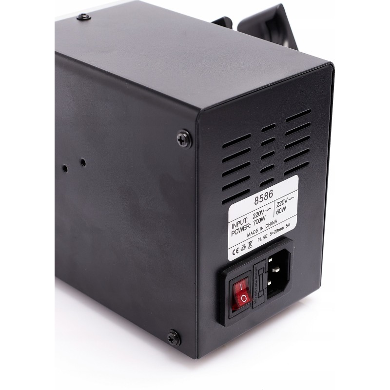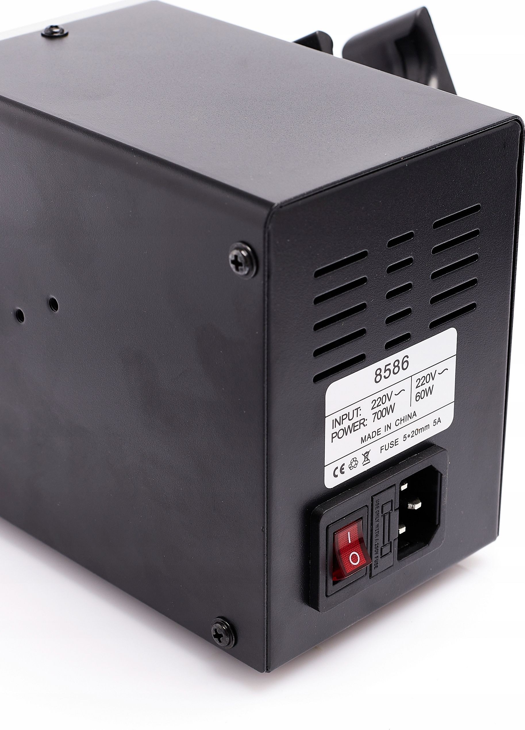 Die Lötstation 8586 ist mit einem leistungsstarken Heizelement ausgestattet, das ein schnelles Aufheizen und eine lange Lebensdauer des Heizelements garantiert. Sie verfügt über eine stufenlose Regelung der Luftzufuhr und der Temperatur. Die Station wurde für Lötarbeiten an Bauteilen wie SOIC-, QFP-, PLCC, BGA, SMD usw. sowie zum Erwärmen, Ausheizen von Schrumpfschläuchen, Auftauen, Auflösen von Klebstoffen, Abbeizen von Farben, Vorwärmen usw. Dank ihrer kompakten Bauweise nimmt die Station sehr wenig Platz ein, und der eingebaute Heißluftventilator sorgt für einen sehr geringen Geräuschpegel.