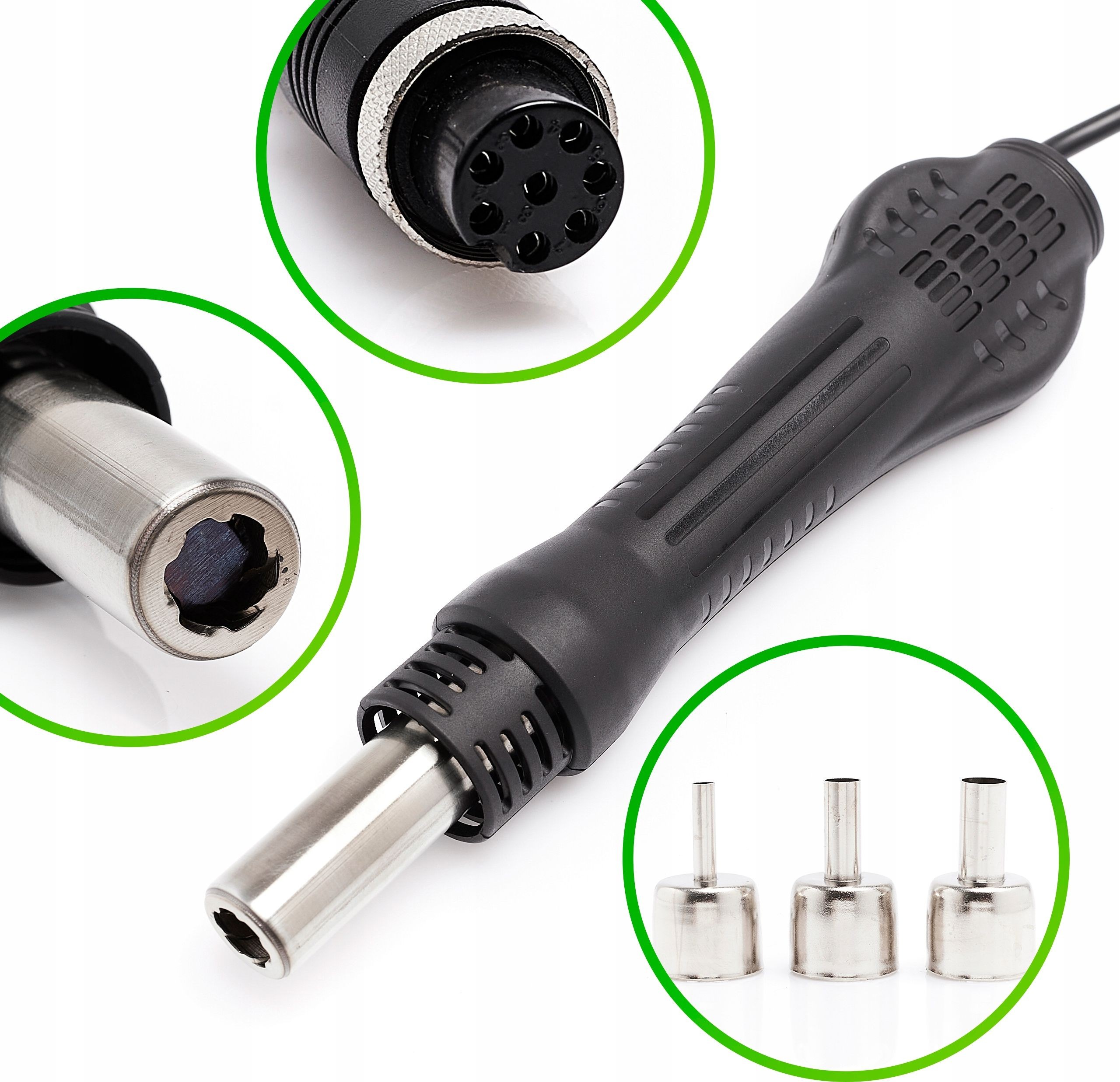 Beide Module der Station, also die Lötkolben- und die Heißluftfunktion, können unabhängig voneinander betrieben werden (die Station verfügt über ein Display, sodass nur die Temperatur eines der Module angezeigt wird; man kann jedoch mit der SET-Taste frei zwischen ihnen umschalten). Die Station ist zusätzlich mit einem automatischen Abkühlsystem nach Beendigung des Betriebs ausgestattet. Dies verlängert die Lebensdauer des Heizelements auf effektive Weise. Dank der hohen Leistung von 60 W und der schnellen Aufheizzeit eignet sich die Lötstation neben dem Lötzinn-Löten auch für das bleifreie Löten (Lead Free). Die Station verfügt über ein robustes Metallgehäuse. Die Luftzufuhr erfolgt über einen Lüfter, wodurch ein langlebiger, störungsfreier Betrieb mit konstanter Luftstromstärke gewährleistet ist und ein sehr leiser Betrieb sichergestellt wird. Der Griff der Station ist klein und komfortabel in der Handhabung. In der Station wird ein gängiger Lötkolben-Typ verwendet, sodass eines von über 30 Lötkolbenmodellen eingesetzt werden kann.