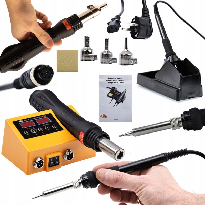 1️⃣ 2-in-1-Lötstation Rosfix Orange Husky OH660: Das Hauptwerkzeug, das ein Heißluftlötmodul sowie ein 60-W-Lötspitzenmodul enthält.