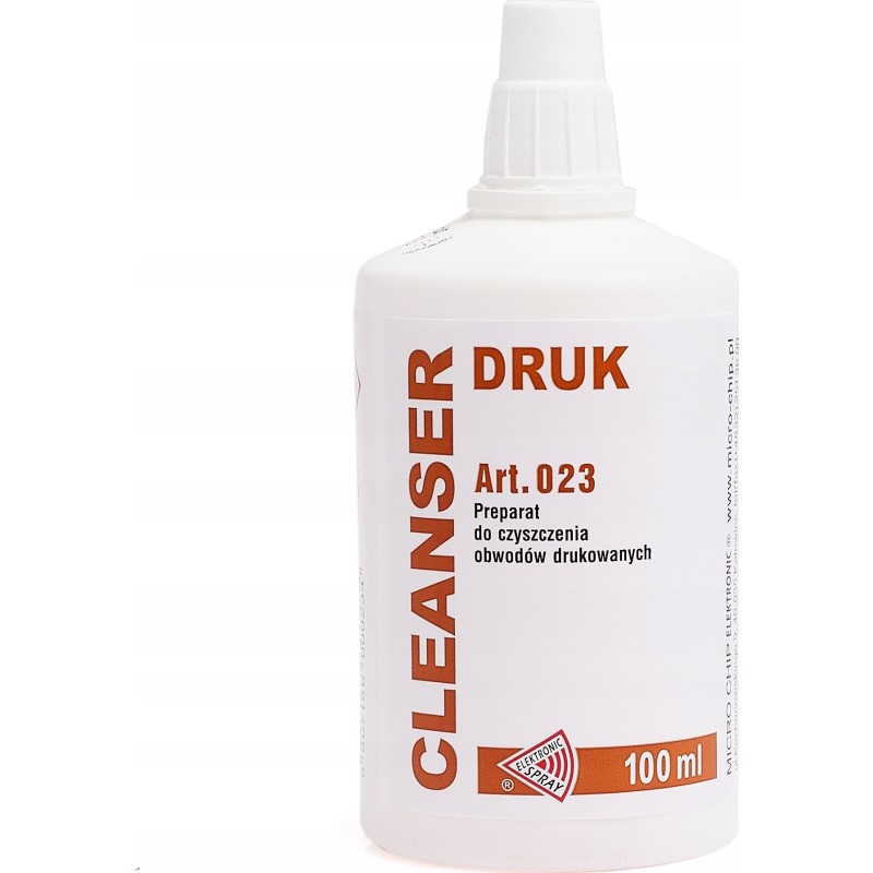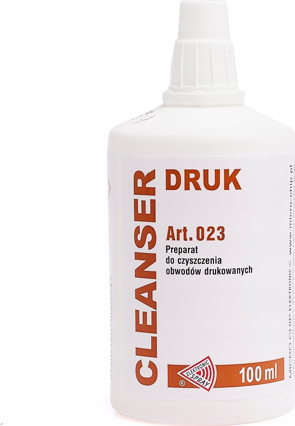 Cleanser Druk 100 ml – Reinigungsflüssigkeit für Leiterplatten. Entfernt schnell und effektiv Lötrückstände sowie Verunreinigungen, die während des Betriebs von Geräten auf Leiterplatten entstehen. Hinterlässt keine Rückstände, verdunstet schnell. Ideal zur Reinigung von Hoch- und Hochfrequenzschaltungen. Unverzichtbar in jeder Elektronikwerkstatt. Besitzt bessere Reinigungseigenschaften als Isopropanol.