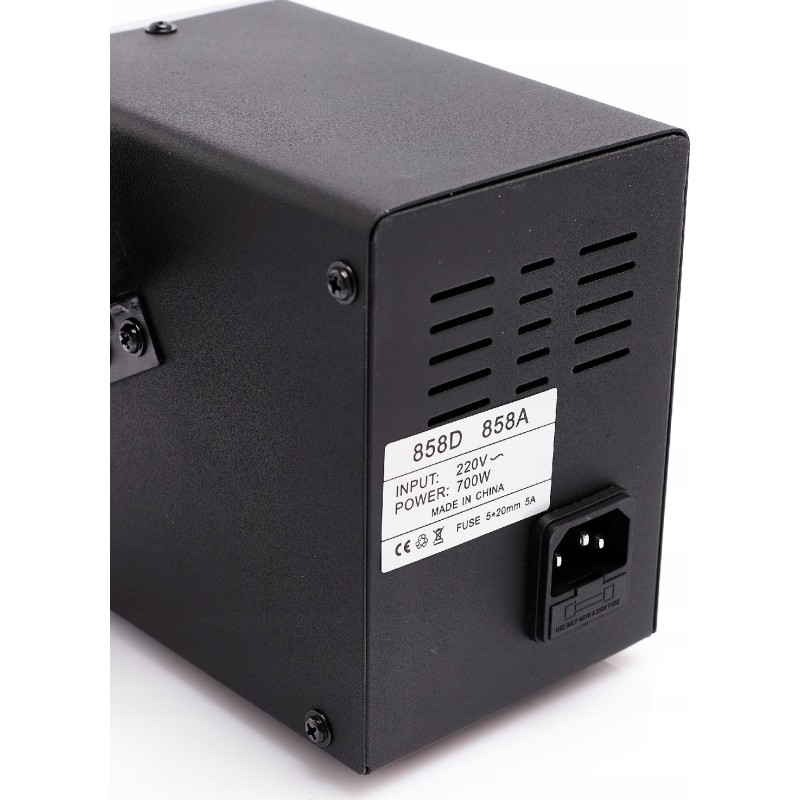Ein leistungsstarkes Heizelement sorgt für eine blitzschnelle Erwärmung auf die gewünschte Temperatur. Zusätzlich wird die Station von einem im Kolben integrierten Ventilator angetrieben, der praktisch geräuschlos ist und keine Vibrationen verursacht, was bei der Arbeit sehr angenehm ist. Ventilator mit bürstenlosem Motor – erhöhte Lebensdauer und leiser Betrieb. Das Modell 858D ist mit einem flexiblen Kolbenkabel ausgestattet, das die Mobilität und den Arbeitskomfort erhöht. Die Station ist mit einem Abstellsensor ausgestattet – wenn der Heißluftschlauch auf die Halterung abgelegt wird, kühlt er automatisch auf 100 °C ab und wechselt anschließend in den Standby-Modus (das Heizelement wird ausgeschaltet). Diese Lösung verlängert die Lebensdauer des Heizelements. Wird der Heißluftfön vom Halter abgenommen, kehrt er zu den vorherigen Einstellungen zurück und heizt sich auf die eingestellte Temperatur auf.