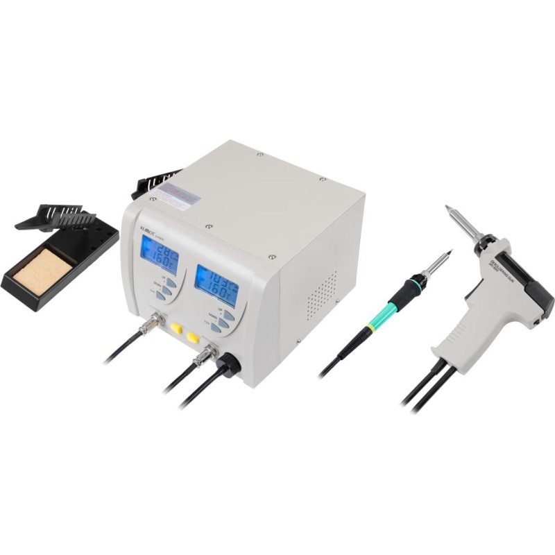 2 unabhängige Digitalanzeigen Elektronische Temperaturregelung Zentraleinheit Stromversorgung: 220–240 V AC, 50 Hz Sicherung: 3 A Lötkolben mit Spitze: Leistungsaufnahme: 60 W Temperaturbereich: 160 °C – 480 °C Heizelement: Keramik Entlötgerät: Leistungsaufnahme: 80 W Pumpenleistung: 600 mmHg Temperaturbereich: 160 – 480 °C Heizelement: Keramik Im Lieferumfang enthalten: Entlötpistole mit montierter Spitze, zwei Ersatzspitzen für die Entlötpistole, Ersatzfilter, 3 Reinigungsstäbe für verschiedene Spitzenstärken, Adapter zum Anschluss der Station an den Kolben, Halterung für den Entlötkolben, Lötkolbenhalter für die Spitze, Lötkolbenständer, Netzkabel