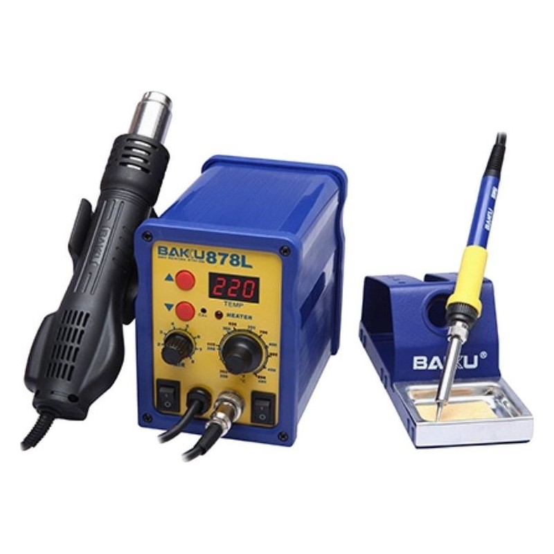 Heißluft- und Lötkolben. Wird in Elektronikwerkstätten zum sicheren Löten temperaturempfindlicher Bauteile eingesetzt. Die Temperatur wird über Tasten und die Gebläseleistung über einen Drehknopf geregelt. Die Station ist mit einem Sensor im Halter für den Lötkolben ausgestattet, der dafür sorgt, dass die Station das Heizelement 3 bis 8 Minuten lang abkühlt und anschließend ausschaltet (Standby-Modus), sobald der Lötkolben auf den Halter abgelegt wird. Dadurch sparen wir Energie und verlängern die Lebensdauer des Heizelements. Sobald der Lötkolben den Standby-Modus erreicht hat, kann er per Knopfdruck vollständig ausgeschaltet oder durch Anheben des Kolbens wieder in Betrieb genommen werden. Die Station speichert die zuletzt eingestellte Temperatur. Stabiler und leistungsstarker Luftstrom durch einen im Kolben integrierten Lüfter. Der Lüfter wird von einem bürstenlosen Motor angetrieben. Temperatureinstellung und stufenlose Regelung des Luftstroms über Tasten. Düsensatz: - Runddüse mit 7 mm Durchmesser - Runddüse mit 8 mm Durchmesser - Runddüse mit 12 mm Durchmesser Halterung für den Lötkolben samt Reinigungsschwamm Technische Daten: Station: Stromversorgung: 230 V Leistung: 750 W Hoitair-Lötkolben: Temperaturregelung der Heißluft: 100–450 [°C] Temperaturstabilität: +/- 1 [°C] Luftdurchsatz: bis zu 120 Liter/Minute [max] Kopfgröße: 22 mm Lötkolben: Temperaturregelung: von 200–480 [°C] Temperaturstabilität: +/- 2 [°C] Leistung: 60 W EAN: 5901737393296