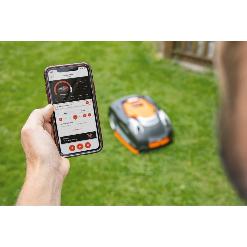 Das mit einem Regensensor ausgestattete Gerät ist in der Lage, Regen zu erkennen. Es unterbricht dann den Betrieb und kehrt zu seiner Ladestation zurück, um ein mögliches Abtragen des Rasens zu verhindern. Der Roboter nimmt den Betrieb wieder auf, sobald sich das Wetter bessert.