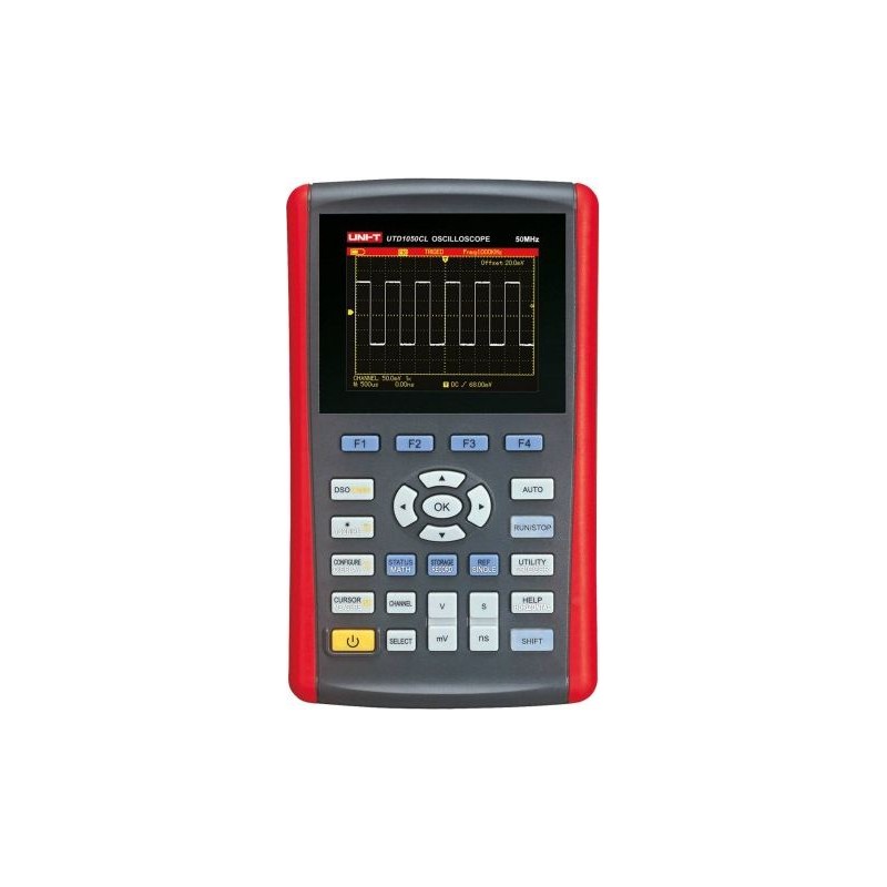 Das UTD1050CL ist ein 50-MHz-Taschen-Digitaloszilloskop und Multimeter in einem. Ein Vorteil des Geräts ist das kontrastreiche Farb-LCD-Display. Dank der Anzeige von 3999 Messwerten ist die Aufzeichnung von Messungen in einem breiten Spannungsbereich – bis zu 200 V/Teilung – sowie von Stromstärke, Widerstand, Dioden, Kapazität und Durchgangsprüfung möglich. Die Funktionalität des Geräts wird zudem durch die einzigartige Aufzeichnung von Messkurven sowie deren Speicherung und Abruf erweitert. Über den USB-Anschluss lassen sich Signale schnell aufzeichnen oder auf einen angeschlossenen Computer übertragen und dort speichern. Der integrierte Akku garantiert 8 Stunden ununterbrochenen Betrieb, der auch fortgesetzt werden kann, wenn das Gerät an das Netzteil angeschlossen wird. HAUPTPARAMETER Analoge Bandbreite: 50 MHz Anzahl der Kanäle: 1 Anstiegszeit: