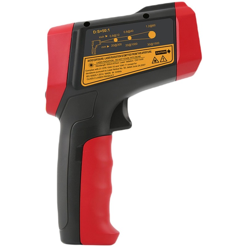 -----------TEMPERATURMESSUNG-----------Messbereich: -50 °C bis 2000 °C (-58 °F bis 3632 °F)Auflösung: 0,1 °CGenauigkeit: +/-1 °C (oder ±1 %)Wiederholgenauigkeit: 0,7 °C (oder 0,7 %)Reaktionszeit: <= 250 msSpektrale Empfindlichkeit: 8 µm ~ 14 µmD:S-Verhältnis: 50:1Emissionsgrad: 0,1 ~ 1,0Lasertyp: Klasse 2Laserleistung: <1 mWLaserwellenlänge: 630 nm ~ 670 nm-----------ZUSÄTZLICHE FUNKTIONEN-----------Alarm bei Grenzwertüberschreitung (akustisch und durch Farbwechsel der Hintergrundbeleuchtung)Einheitenauswahl: °C/°F Anzeige für niedrigen BatteriestandHintergrundbeleuchtung des Displays-----------ALLGEMEINE MERKMALE-----------Displaytyp: EBTN (35 x 35 mm)Stromversorgung: 9-V-Batterie (6F22) (nicht im Lieferumfang enthalten)Betriebstemperatur und -feuchtigkeit: 0 °C ~ 50 °C (32 °F ~ 122 °F); <90 % RHLagerungstemperatur und -feuchtigkeit: -20 °C ~ 60 °C (-4 °F ~ 140 °F); <85 % RHProduktabmessungen: 172 x 113,5 x 53 mmProduktgewicht (ohne Batterie): 310 g